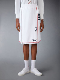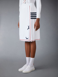 DETAILS & FIT This luxurious skirt captures attention with its striking white base and bold red and blue detailing. Minimalist yet distinctive, it exemplifies Thom Browne's mastery of innovative design and tailored excellence, making it a true statement piece. Heralded as the most famous dog muse in fashion, Thom Browne’s very own dachshund Hector served as the inspiration behind this piece. Pair it with our Pointelle Hector Cardigan Jacket. Pull on 4-bar detailing Signature striped grosgrain loop tab Model is 5'10" (178 cm), wearing size 40 83% Viscose, 17% Polyester Made in Italy FKK135B-Y5502-100