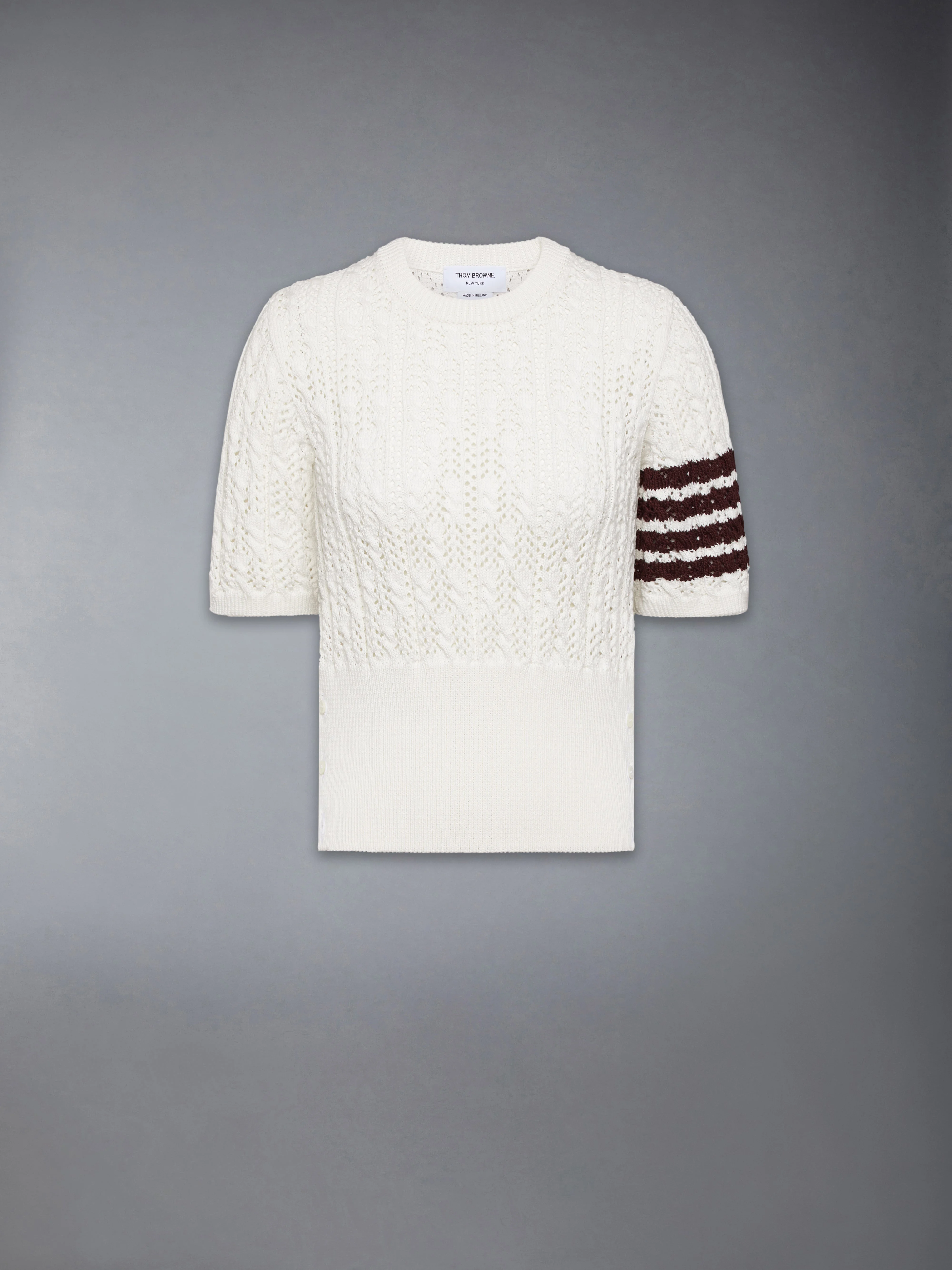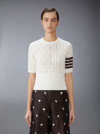 Inspired by preppy American country life, this elegant tee features a romantic pointelle stitch and signature 4-bar detailing. A versatile piece, it pairs effortlessly with any of our trousers or dress shirts for a sophisticated yet casual look. 4-bar detailing Buttoned side vents with signature striped grosgrain trim Signature striped grosgrain loop tab Model is 5'10" (178 cm), wearing size 40 100% Cotton Made in Italy FKA495A-Y3017-100 FKA495A-Y3017-100