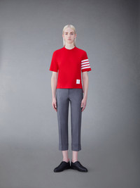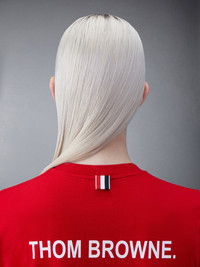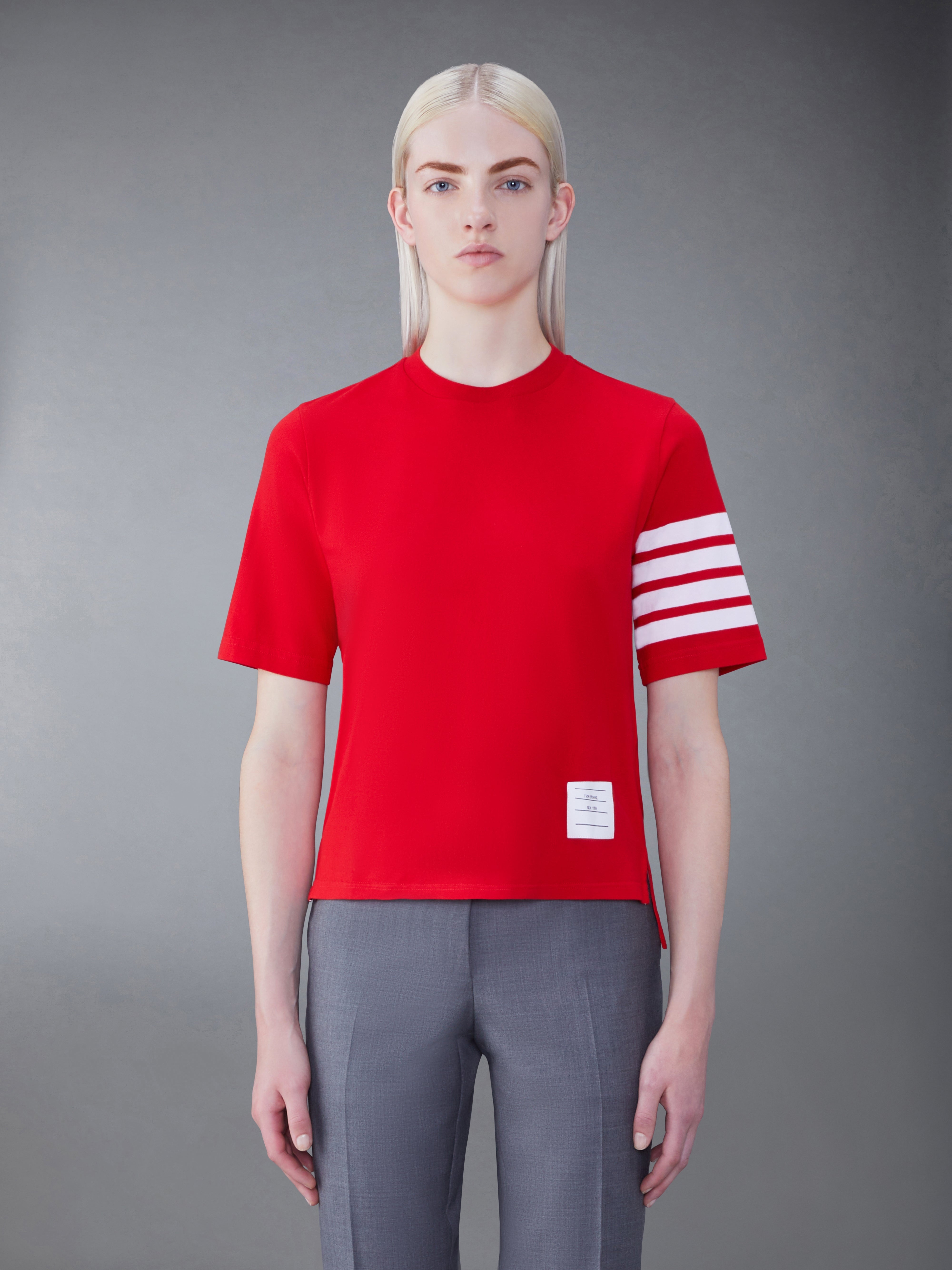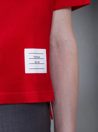 Short sleeve tee in red cotton jersey with emblazoned '2003' and logo at back, along with engineered 4-bar stripe details in white on left sleeve. Crew neckline and a name tag applique above hem. Side vents with signature striped grosgrain trim. Signature striped grosgrain loop tab at back of neck. Model is 5'10" (178 cm), wearing size 40 100% Cotton Made in Italy FJS102B-07862-600