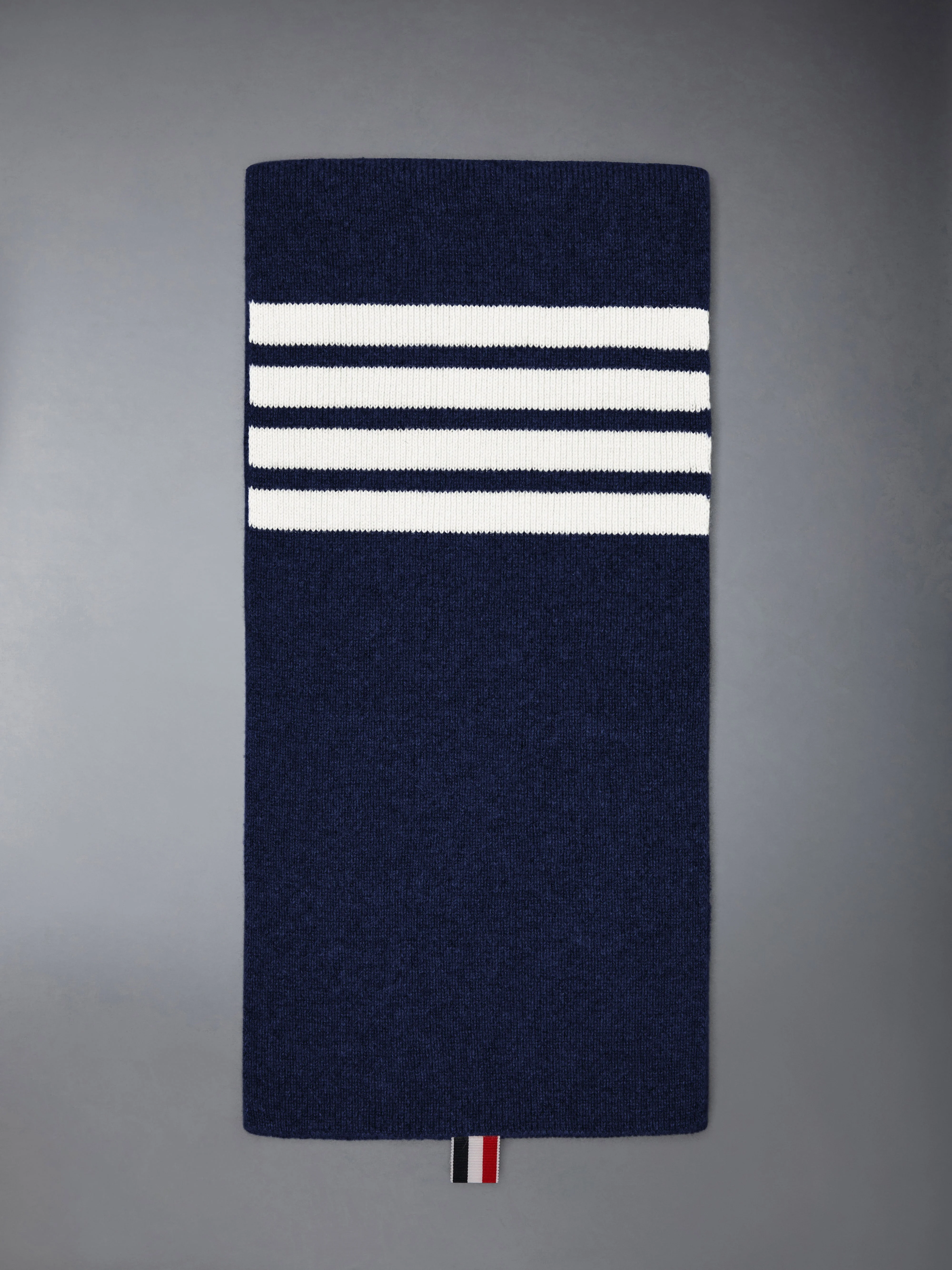 A statement-making essential for cooler months, our Cashmere Rib 4-Bar Scarfis adorned with Thom Browne's signature 4-Bar Stripes. 4-bar stripe detail Signature striped grosgrain loop tab at one end 100% Cashmere Made in Italy MKS026A-00011-415