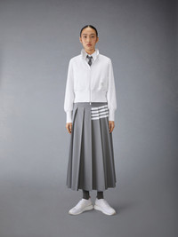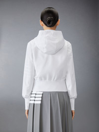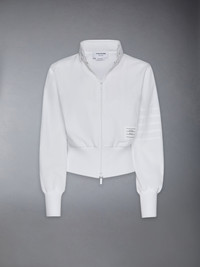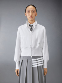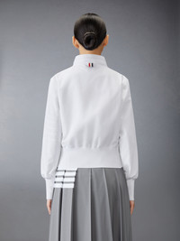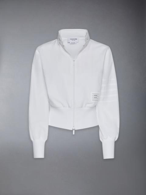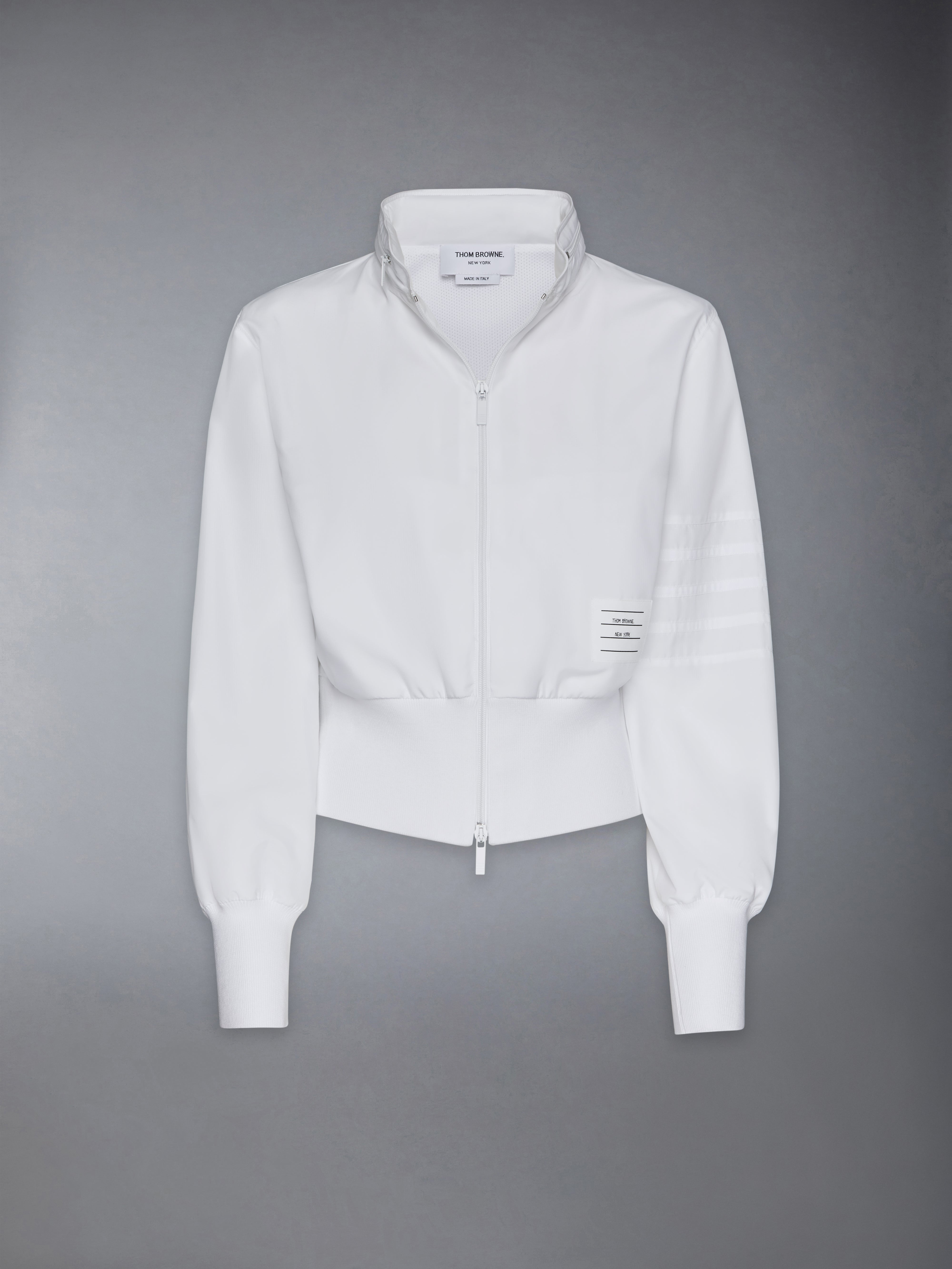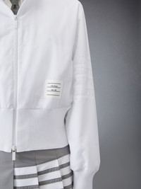 A sophisticated windbreaker emblazoned with signature Thom Browne emblems, perfect for activity-filled, humid spring days. Our Ripstop fabric is ultra-durable, tear and rip-resistant with a water-repellent finish. Front zip closure Name tag applique 4-bar detailing Signature striped grosgrain loop tab Model is 5'10" (178 cm), wearing size 40 100% Nylon Made in Italy FJT387A-08031-100