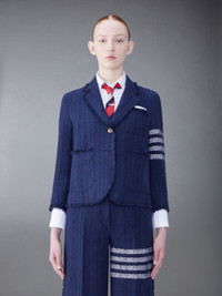 DETAILS & FIT Impeccable craftsmanship, fine fabric, and distinctive Thom Browne emblems make this jacket an essential garment for your seasonal wardrobe. Pair it with any of our tweed trousers. Our fine tweed fabric is sourced from a fabric mill founded in 1912 in Carlisle, England. 4-Bar detailing Front button closure 3 patch pockets Buttoned cuffs with signature striped grosgrain trim Single vented back Striped lining with interior pockets and name tag Signature striped grosgrain loop tab Model is 5'10" (178 cm), wearing size 40 40% Polyester, 38% Acrylic, 13% Wool, 6% Cotton, 1% Polyamide, 1% Acetate, 1% Viscose Lining: 100% Silk FBC788T-F0513-415