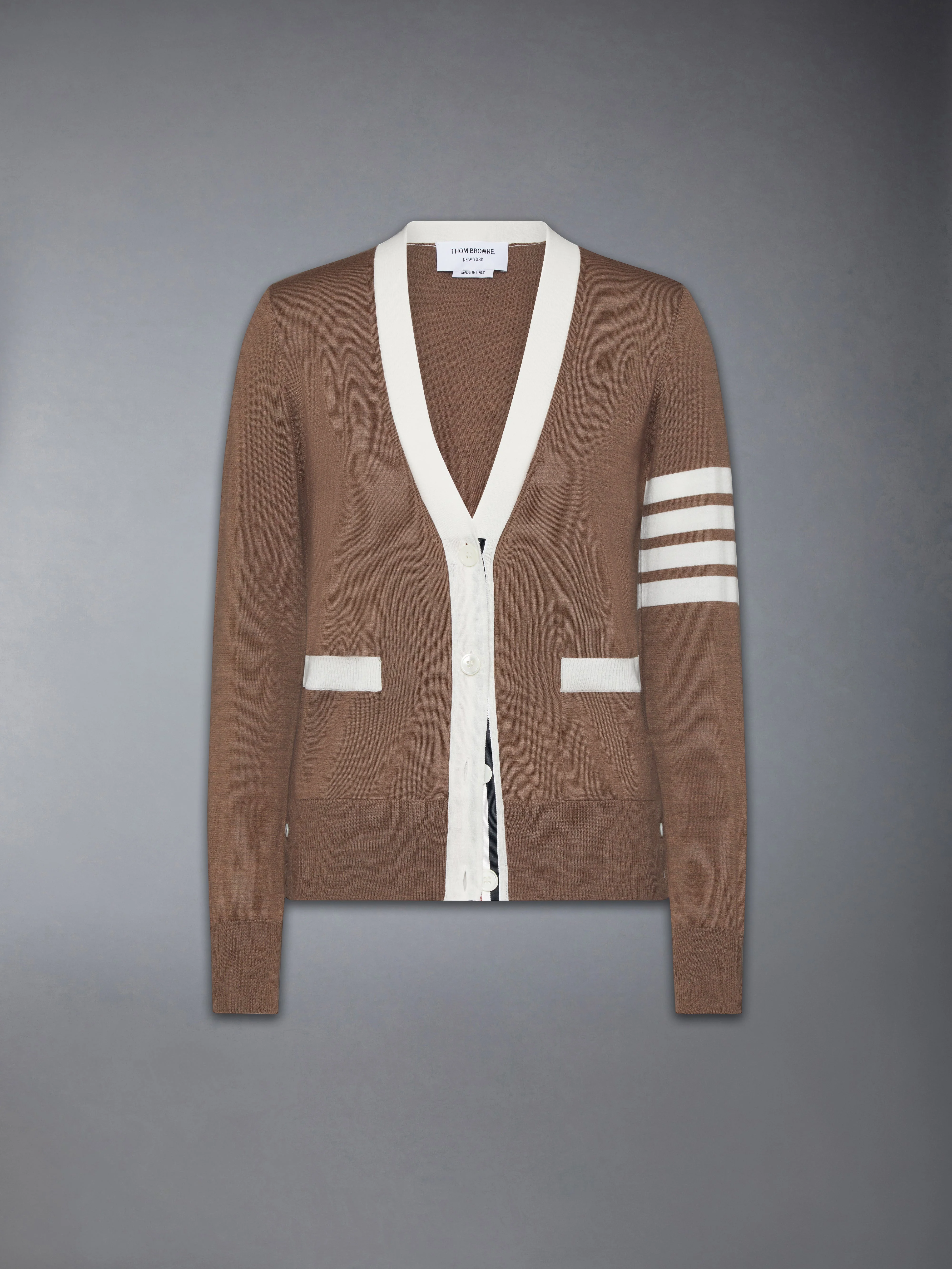 FINE MERINO WOOL 4-BAR V NECK CARDIGAN
