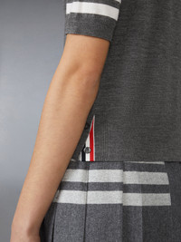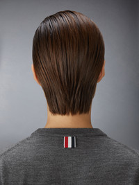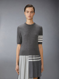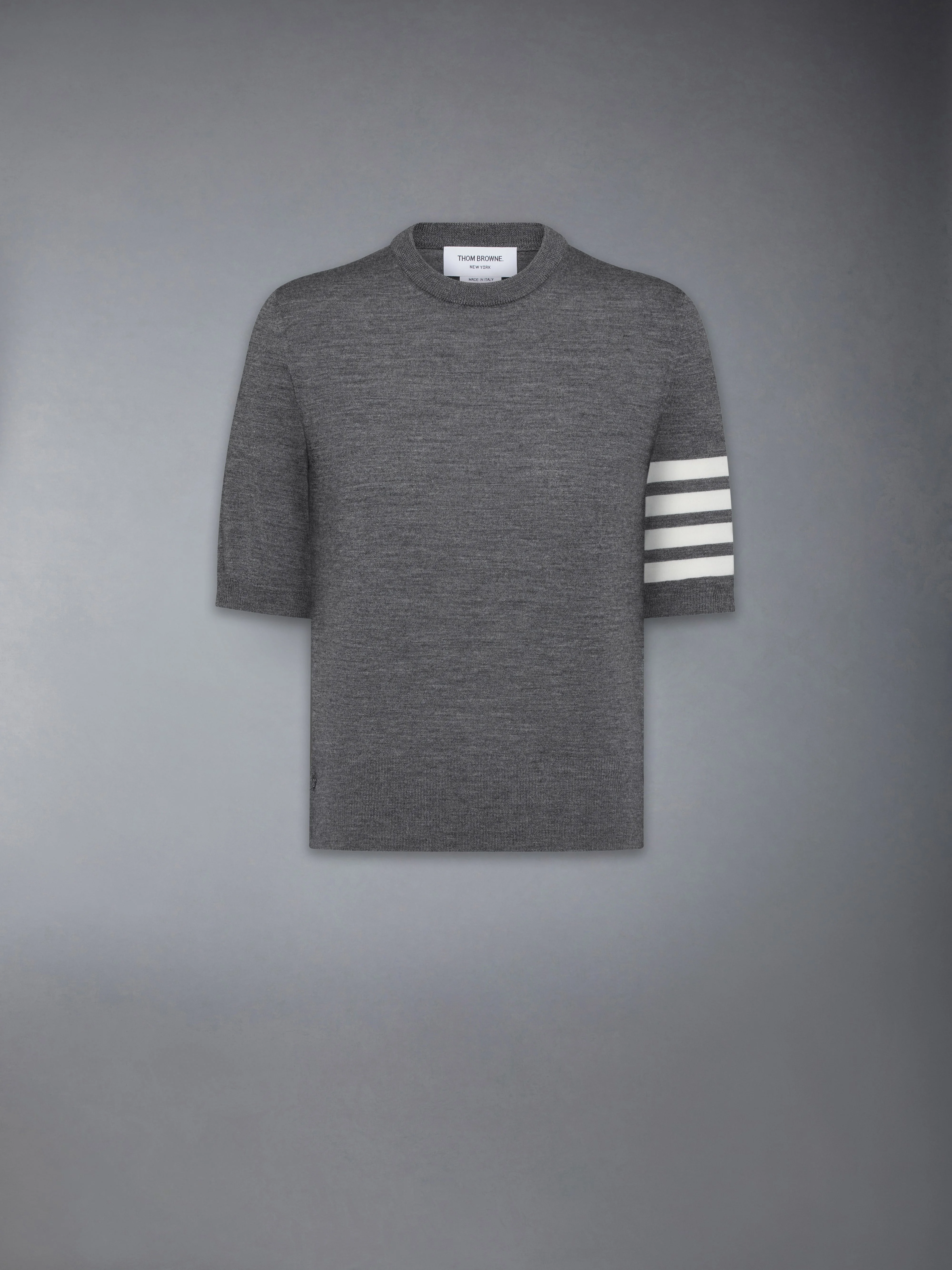 A timeless staple with a signature Thom Browne touch, this classic sweater features our iconic 4-Bar detailing, symbolizing discipline, achievement, and tenacity. Crafted from lightweight merino wool, it offers warmth and versatility, making it a perfect layering piece for transitional dressing and year-round wear. 4-bar detailing Buttoned side vents with signature striped grosgrain trim Signature striped grosgrain loop tab Model is 5'10" (178 cm), wearing size 40 99% Virgin Wool, 1% Polyamide Made in Italy FKA471B-Y1014-035
