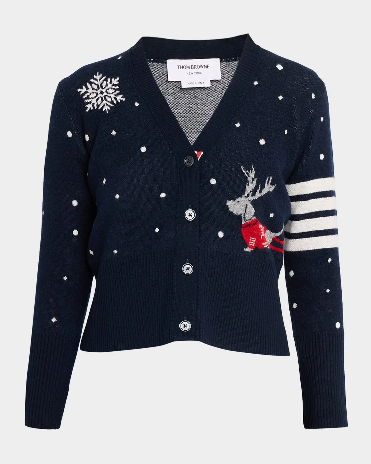 This cardigan by Thom Browne offers & nbsp;an intarsia-knit winter scene of & nbsp;snowflakes, hector as a reindeer, and signature four bar stripes on the left sleeve V-neckline Button front Long sleeves Button cuffs Slim fit Hip length Ribbed cuffs and hem Virgin wool Made in Italy SIZE & FITModel measurements: 5 & apos;10" tallModel is wearing a US size 4/Small