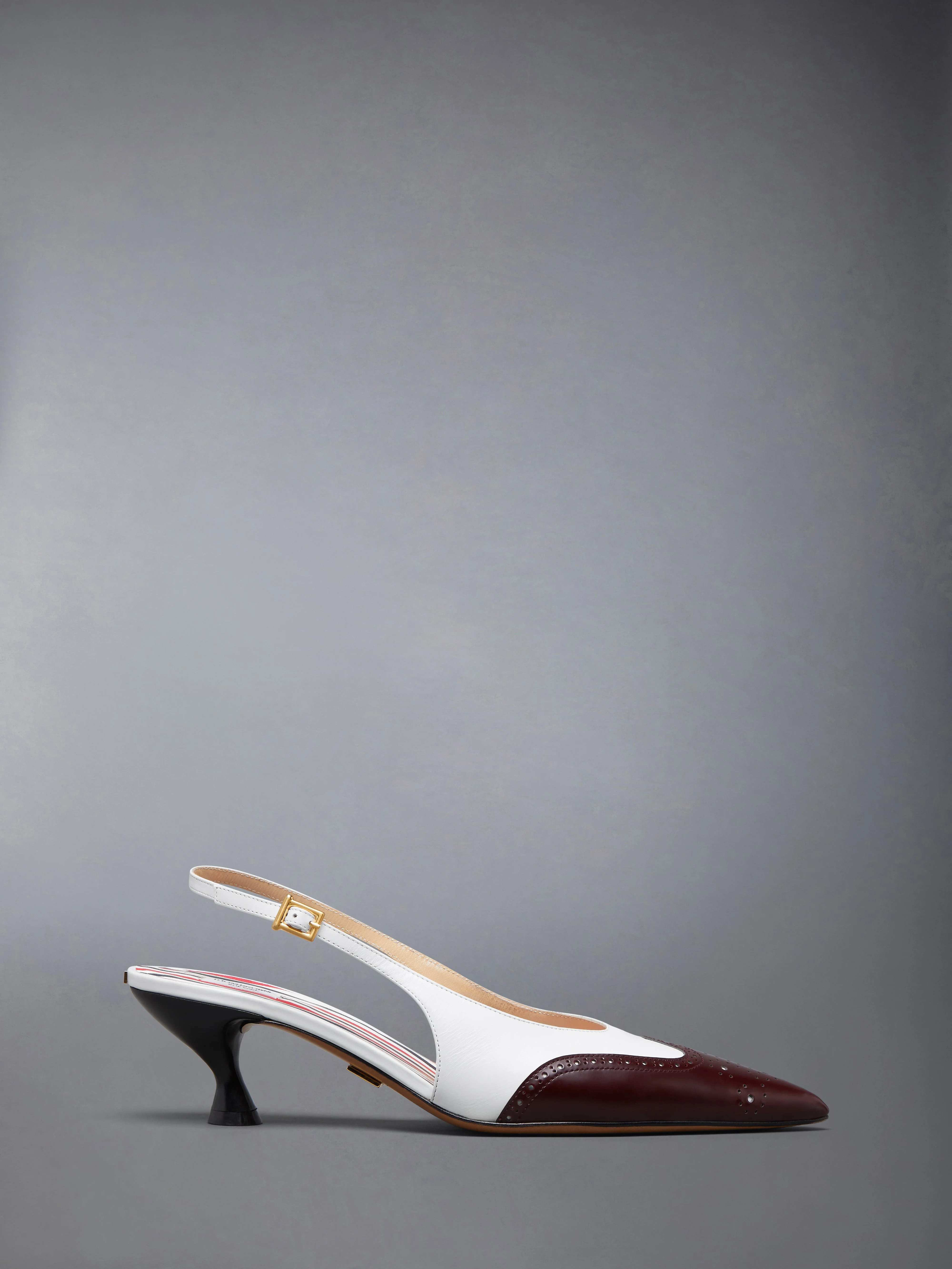 This slingback draws from brogued footwear and reimagines it with bold precision. Crafted in shiny calf leather with contrast spazzolato overlays, the sharply pointed toe and spool heel bring a directional edge to a classic silhouette in a balance of heritage detailing and modern refinement. Adjustable slingback strap with buckle Wingtip brogue detailing Tricolor insole Signature striped grosgrain loop tab 50mm spool heel Upper: 100% Calf Leather Sole: 100% Calf Leather Lining: 100% Goat Leather Lining 2: 100% Calf Leather Made in Italy FFI017A-L0126-612