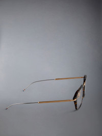 DETAILS & FIT Rectangular eyeglasses in tortoiseshell acetate and gold tone titanium. Textured nose bridge, titanium nose pads and temples, striped enamel temple tips. Leather case with signature striped grosgrain loop tab at entry. Lens Width: 52mm Nose Bridge Length: 21mm Temple Length: 150mm 50% Acetate, 50% Titanium Made in Japan UEO423A-G0003-205-52