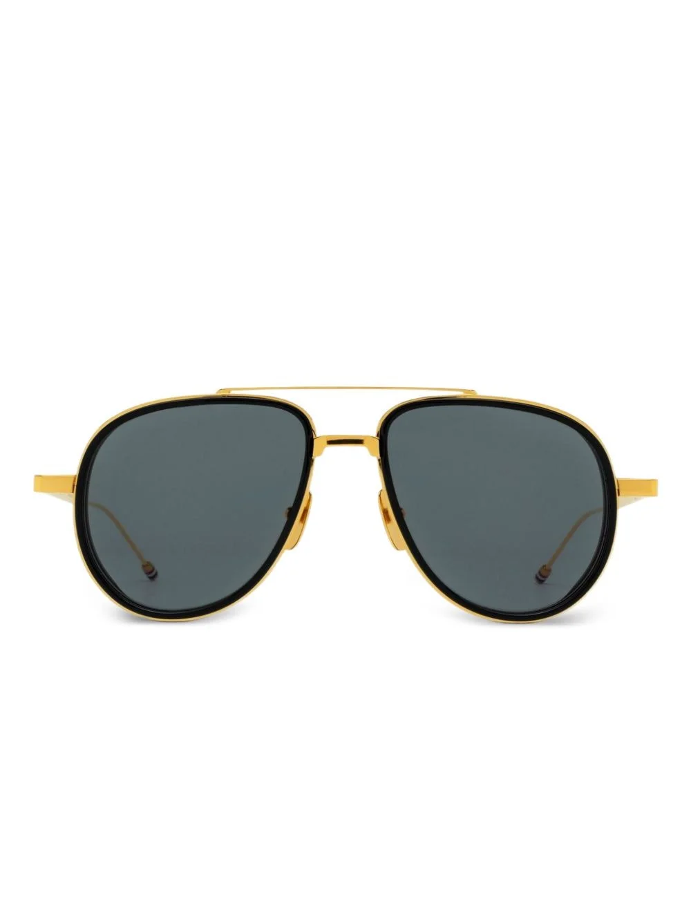 pilot-frame sunglasses Highlights - Gold-tone - Pilot frame - Grey tinted lenses - Straight arms - Curved tips - These glasses come with a protective case. Imported Composition Titanium 100% SIZE & FIT Measurement Arm Length 5.74 in(14.6 cm) Bridge Width 0.7 in(1.8 cm) Lens Diameter 2.2 in(5.6 cm)