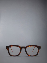 DETAILS & FIT Always true to our American DNA and inspired by mid-century aesthetic, the Thom Browne eyewear collection is ideal for those who appreciate a sleek and sophisticated look. It's designed for individuals who exude confidence and wish to tell a story through their fashion statement. Honey tortoise with 12k gold plate titanium Clear lens Rectangular shape Signature 4-bar Striped enamel temple tips Eco-leather case Lens Width: 48mm Nose Bridge Length: 23mm Temple Length: 147mm 100% Acetate Made in Japan UEO412A-G0002-215