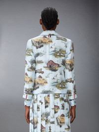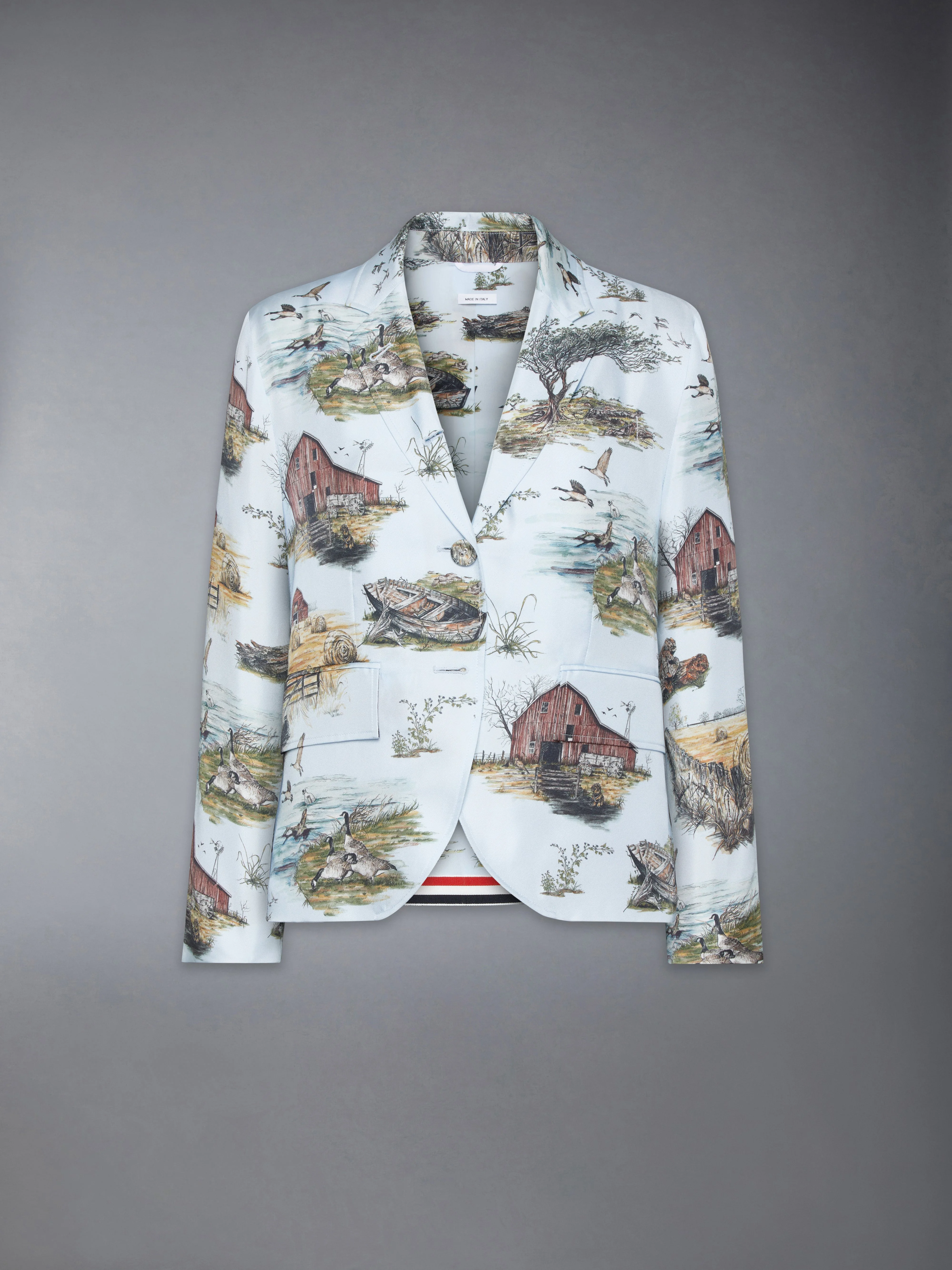 Like a fine art work, this jacket demands a second glance—where a story lies in every stitch. Geese pause in their seasonal migration, leisurely resting by the wetlands, while Hector moseys through the scene, a quiet companion in their downtime. With its refined tailoring and intricate detailing, formal wear is transformed into something to be admired, studied, and remembered. A piece not just to wear but to experience—one that lingers in the mind long after the moment has passed. Our silk twill fabric is nearly weightless for ultimate comfort and breathability. Front button closure Single chest pocket 2 Front flap pockets Buttoned cuffs with signature striped grosgrain trim Double vented back Interior pockets with name tag Signature striped grosgrain loop tab Fit 3 Model is 5'10" (178 cm), wearing size 40 100% Silk Lining: 100% Silk Made in Italy FBC812A-F0975-996
