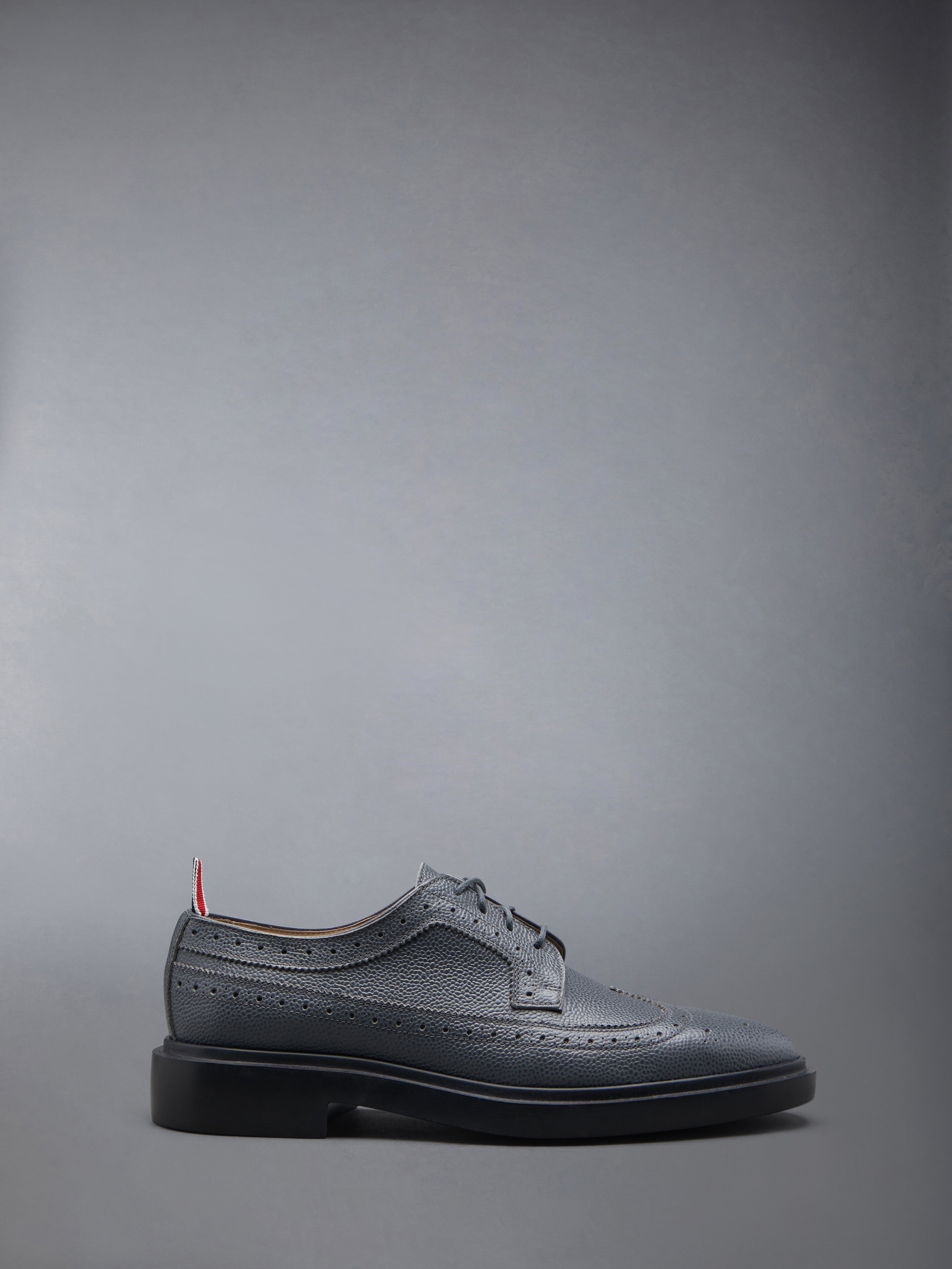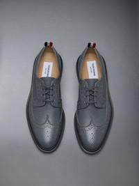 Classic longwing brogue shoe in grey pebble grain leather with lightweight black rubber sole. Tonal lace up closure, broguing perforation throughout. Signature striped grosgrain loop tabs at heels. Upper: 100% Calf Full Grain Leather Sole: 100% Rubber Lining: 100% Calf Leather Made in Italy FFO002G-00198-025