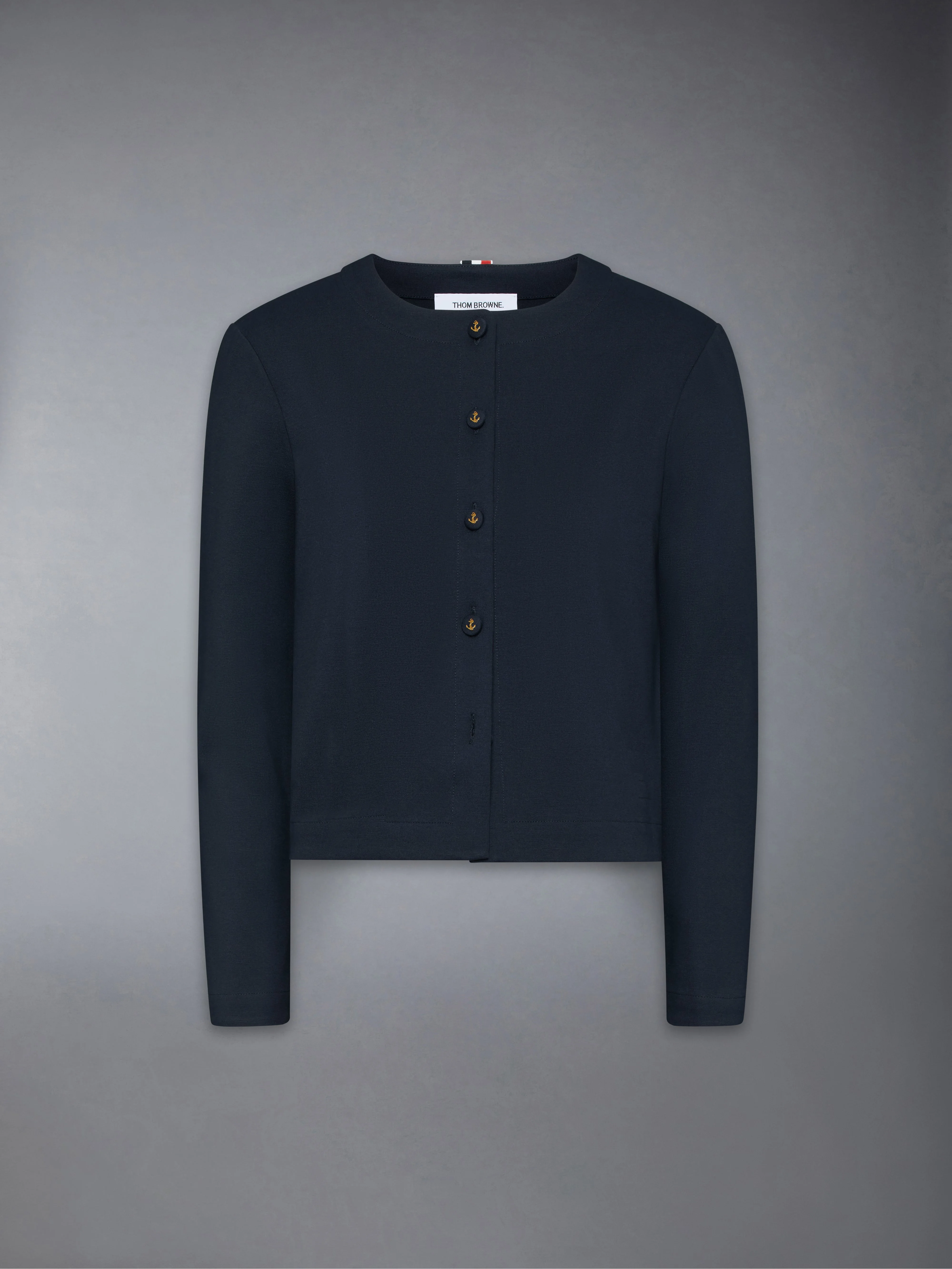 A timeless essential with a Thom Browne twist, this classic cardigan is elevated with self-covered buttons with the Thom Browne insignia. Crafted from breathable cotton, it’s a versatile layering piece that can be worn year-round. Pair it with our Pinstripe High Twist Wool High Waisted Pencil Skirt. Front button closure Signature striped grosgrain loop tab Model is 5'10" (178 cm), wearing size 40 100% Cotton Made in Italy FJT388A-J0215-415