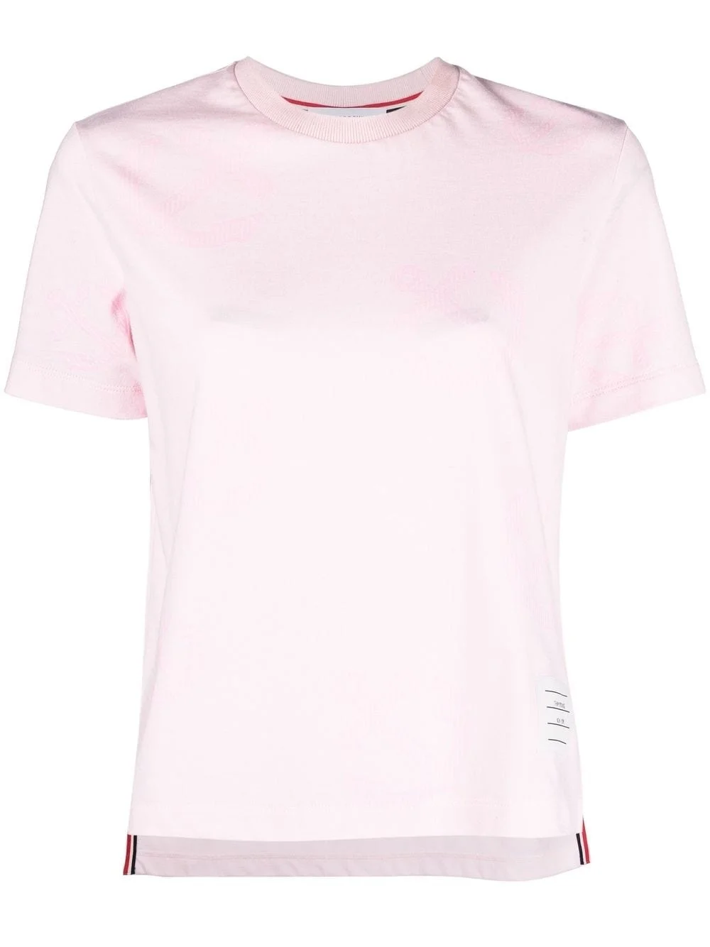 anchor-print T-shirt Thom Browne embraces a nautical theme with this T-shirt. In a tonal pink hue, an anchor print details the piece, adding a lively finish to the design. Made in Italy Composition Cotton 100% SIZE & FIT Model measurements Height 5 ft 10 in(1.78 m) Bust/Chest 33.07 in(84 cm) Hips 35.82 in(91 cm) Waist 25.98 in(66 cm) FittingInformation This piece fits true to size. We recommend you get your regular size Cut for a relaxed fit Made with a mid-weight fabric