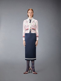 Crafted with Thom Browne’s signature proportions and meticulous tailoring, this shrunken cardigan was designed for versatile styling. Wear it with our gingham separates or classic uniform trousers—unexpected combinations are encouraged. Crafted from fine merino wool for ultimate warmth. Shrunken fit Front button closure with striped grosgrain placket 2 Front slip pockets Signature striped grosgrain loop tab Model is 5'10" (178 cm), wearing size 40 97% Virgin Wool, 3% Polyamide Made in Italy FKC679B-Y1029-640