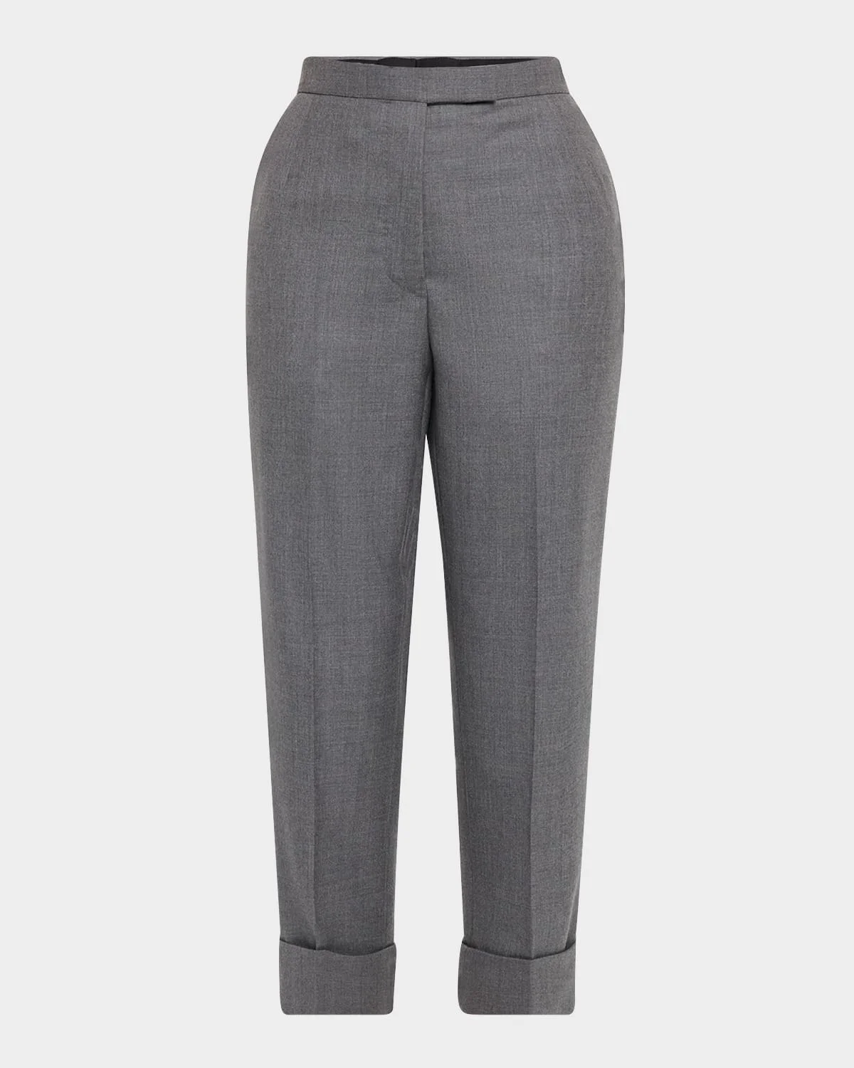 - Thom Browne wool-blend twill trousers featuring a backstrap detail and a signature striped grosgrain tab - Mid rise sits high on hip - Side slip pockets - Back button-welt pockets - Straight fit - Cropped length - Rolled cuffs - Hook-tab/zip fly - Wool/cotton - Made in Italy