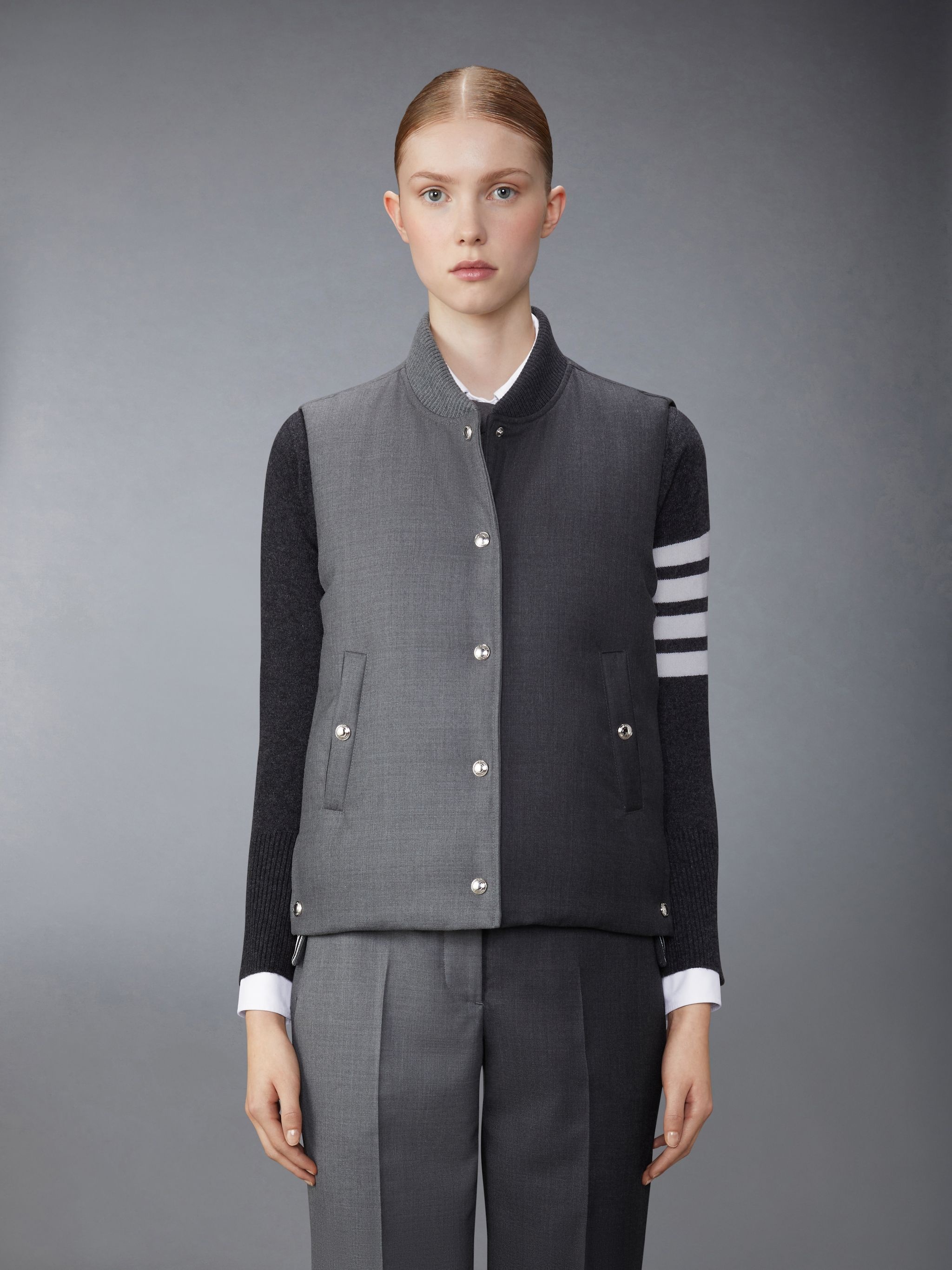 DETAILS & FIT Inspired by Edgar Allan Poe's "The Raven," this handsome vest contrasts light and dark, symbolizing the beauty and darkness inherent in Poe's renowned literary work. Layer it over any of our dress shirts. Snap button closure Snap side pockets Snap button side vents with signature striped grosgrain trim Tricolor stripe lining with interior pockets and name tag Signature striped grosgrain loop tab Model is 5'10" (178 cm), wearing size 40 100% Wool Combo2: 90% Wool, 6% Polyamide, 4% Elastane Padding: 80% White Goose Down, 20% White Goose Feathers Lining: 100% Polyester Made in ITALY FVD020Y-00626-035