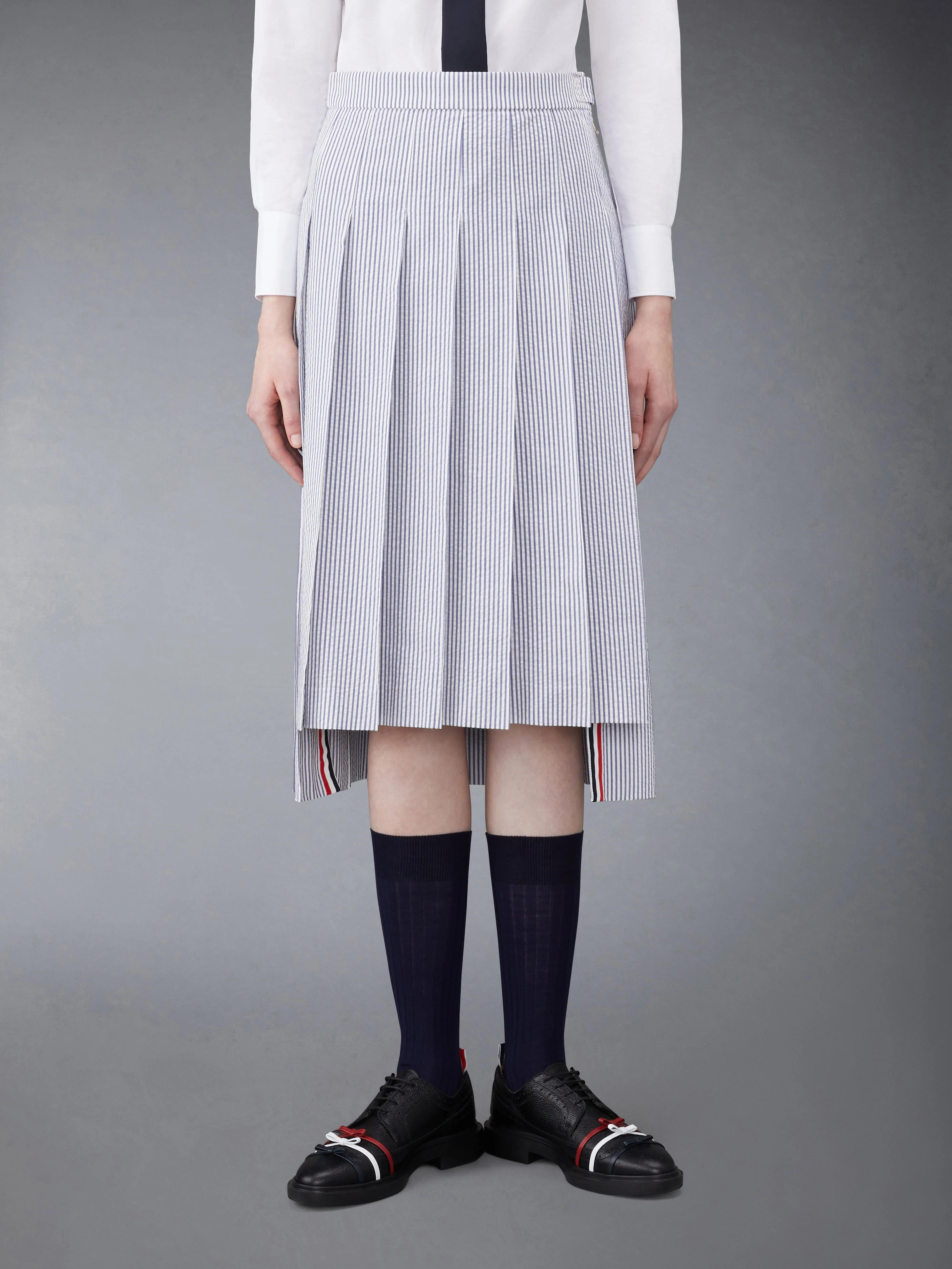 DETAILS & FIT Inspired by East Coast preppy icons but reimagined with inventive proportions and quality craftsmanship, our Classic Seersucker Pleated Midi Skirt is a bold summer staple. zip side closure Dropped back hem with signature striped grosgrain trim Adjustable Buttoned backstrap Signature striped grosgrain loop tab at back waist Model is 5' 10" (178cm), wearing size 40 100% Cotton Lining: 100% Cupro Made in Italy FGC400V-00572-415