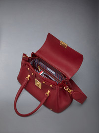 A silhouette that nods to the iconic Mr. Thom bag. The Bolton Bag will suit any romantic backdrop and capture quiet elegance. Crafted in supple pebble grain leather with adjustable gussets and a braided RWB chain. Designed for day-to-day structure with travel-ready functionality, it balances signature polish with a more relaxed attitude. Wear the bag to offset boxy proportions or soften tailored layers. Padlock flap closure Top handles Key bell with RWB grosgrain trim Detachable adjustable leather shoulder strap Detachable RWB ribbon-woven chain strap RWB stripe on front and back Adjustable side gussets with belt and stud details Interior zip pocket, slip pocket, and two smaller slip pockets Tricolor lining Signature striped grosgrain loop tab 100% Calf Full Grain Leather Lining: 100% Polyester Made in Italy FAP483A-L0105-614