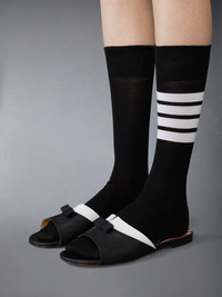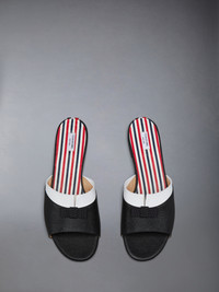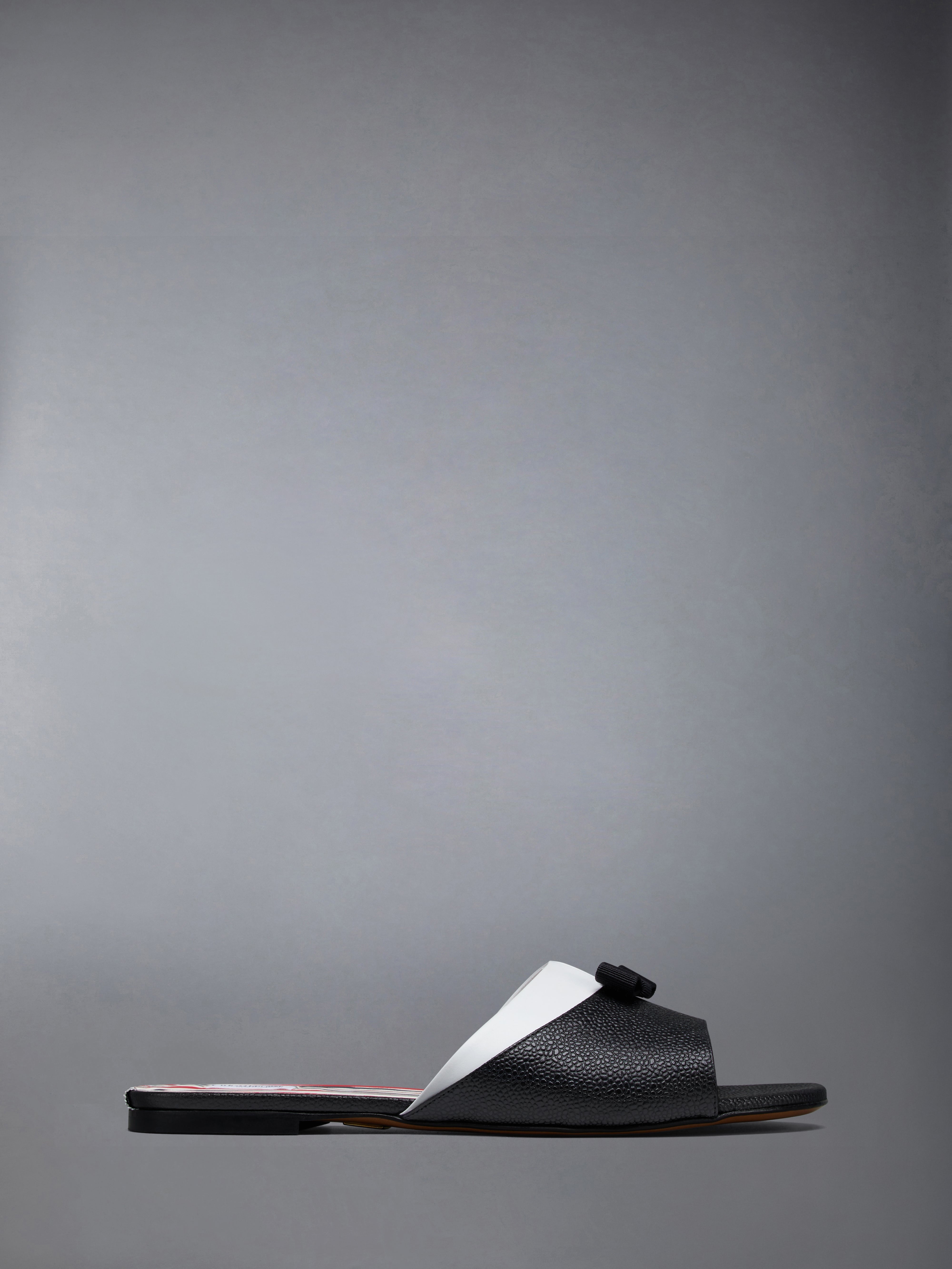 An elegant sandal to elevate your spring wardrobe — our Pebble Grain Bow Claquette. Slip on Tricolor stripe lining Combo 1: 100% Calf Leather Upper: 100% Calf Leather Sole: 100% Calf Leather Lining: 100% Lamb Leather Lining 2: 100% Goat Leather Made in Italy FFA002A-00198-980