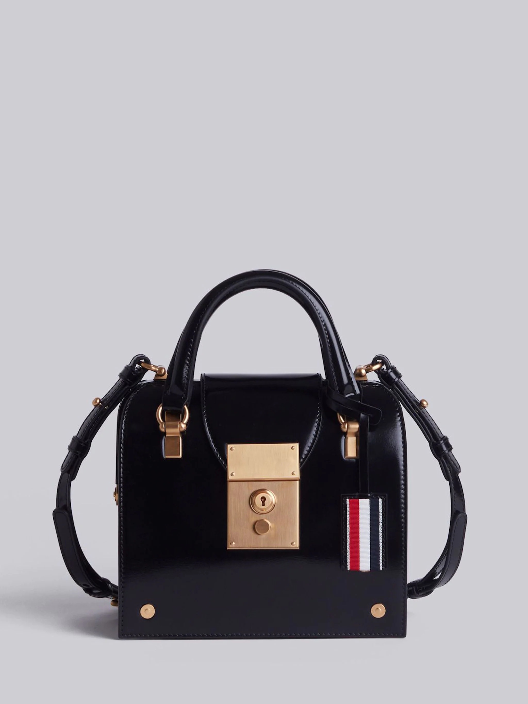 DETAILS & FIT Black Mrs. Thom Mini Bag Smooth Calfskin Leather Brass Hardware Lock Closure Internal Slip Pocket Tricolor Stripe Lining Adjustable Shoulder Strap Signature Grosgrain Loop Tab Striped Grosgrain Leather Key Pocket 8 x 7.5 x 4" NOTES 100% Leather Made In Italy FAP026A00003001 - WIDTH: 20.0cm - HEIGHT: 18.0cm - HANDLE: 10.0cm - DEPTH: 10.0cm - STRAP: 60.0cm