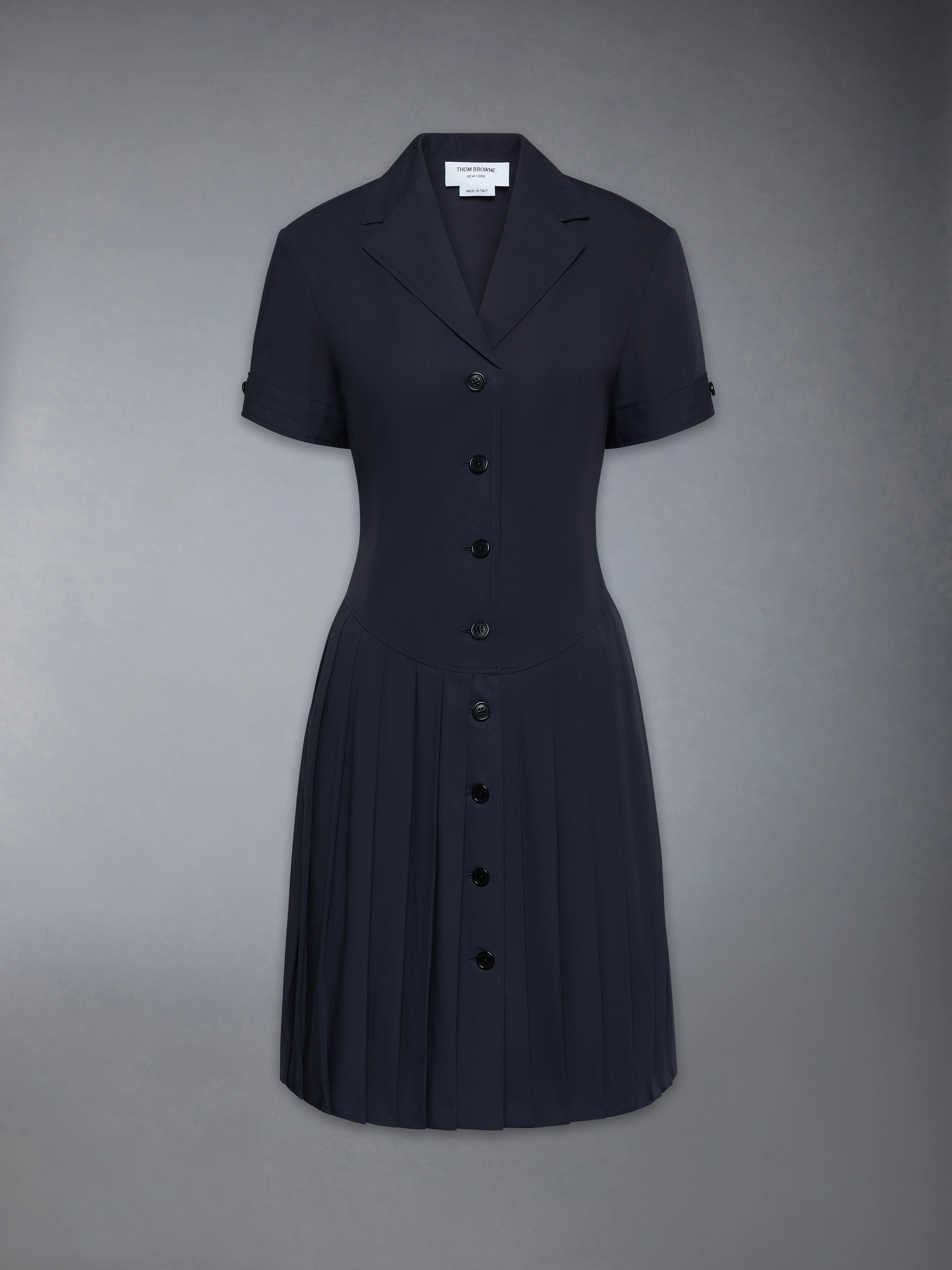 Tailored in crease-resistant cotton with a crisp hand, this pleated dress blends structure with movement. A curved waist seam and back adjusters bring subtle definition to the silhouette, while the sharp collar adds a distinct point of formality. Layered over shirting and a tie, it completes a uniform look with quiet precision. Cotton suiting Front button closure Lapel collar Notched cuffs with button detail Curved front waist seam with shaping darts Pleated skirt Adjustable button-fastening waist tabs with RWB grosgrain trim Signature striped grosgrain loop tab Bermuda length Model is 5'10" (178 cm), wearing size 40 100% Cotton Made in Italy FDSF49U-F1063-415