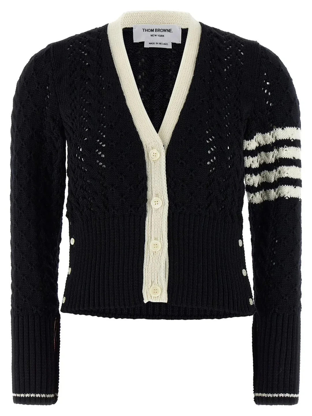 Thom Browne Cable Pointelle Stitch Classic delivers heritage-inspired knitwear with signature preppy sophistication. Crafted from premium wool blend featuring intricate cable knit construction with pointelle stitch detailing throughout. The cropped silhouette and signature 4-bar striping create a refined statement piece with Thom Browne's unmistakable aesthetic.