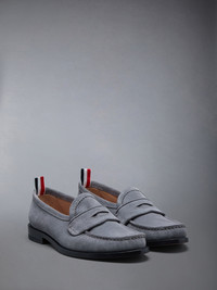 Timeless. Luxurious. Unmistakably Thom Browne. Expertly crafted from the world’s finest suede, these loafers are made to stand the test of time. Pair them with our signature pleated skirts or trousers. Slip on Signature striped grosgrain loop tabs Upper: 100% Calf Suede Leather Sole: 100% Calf Leather Lining: 100% Calf Leather Made in Italy FFF173A-L0037-035