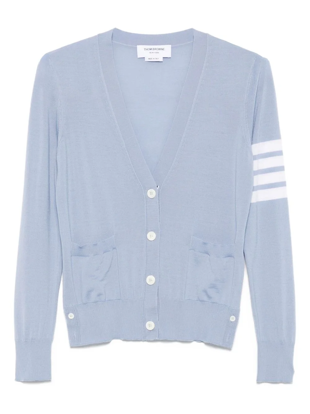 virgin wool cardigan Highlights - Light blue - Front button fastening - V-neck - Long sleeves - Side slit pockets Made in Italy Composition Virgin Wool 100% SIZE & FIT Model measurements Height 5 ft 10 in(1.78 m) Bust/Chest 33.46 in(85 cm) Hips 36.22 in(92 cm) Waist 23.22 in(59 cm) Washing instructions Hand Wash