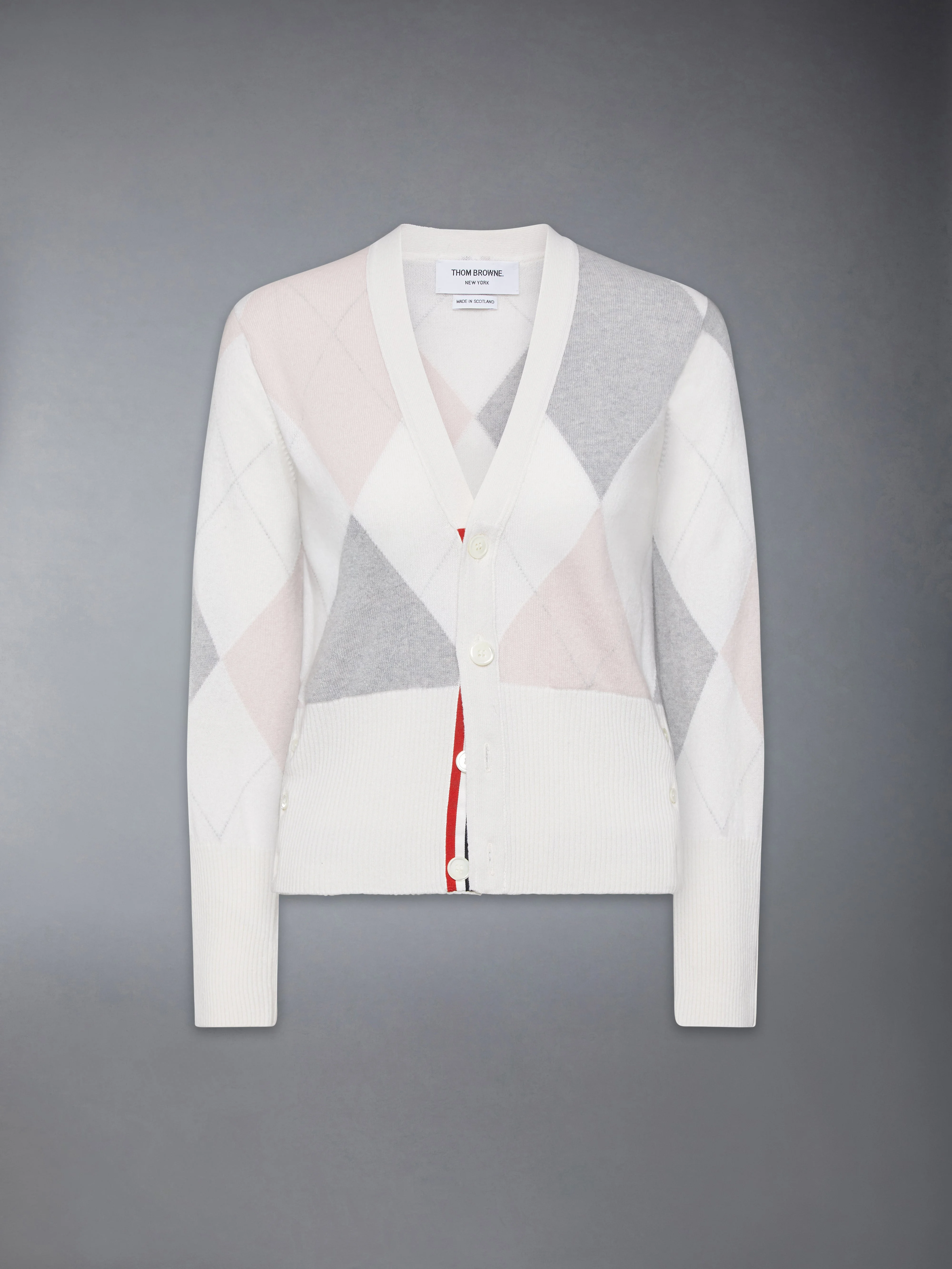 Inspired by preppy country life charm, this classic argyle sweater features Thom Browne's signature touches—grosgrain trim at the front, cuffs, and side vents. Subtle reminders of Thom's commitment to subverting classic wear. A fresh take on tradition, blending sophistication with modern craftsmanship. Crafted in luxurious cashmere. Style it with our Wool And Silk Goose Wide Leg Shorts, Prince of Wales Huntington Tweed Goose Sport Coat, Gingham Check Poplin Round Collar Shirt, and Soft Spazzolato Leather Stud Thom John. Front button closure with striped grosgrain placket Buttoned cuffs with signature striped grosgrain trim Buttoned side vents with signature striped grosgrain trim Signature striped grosgrain loop tab Model is 5'10" (178 cm), wearing size 40 100% Cashmere Made in Italy FKC659A-Y2001-100