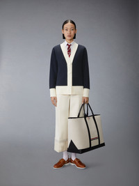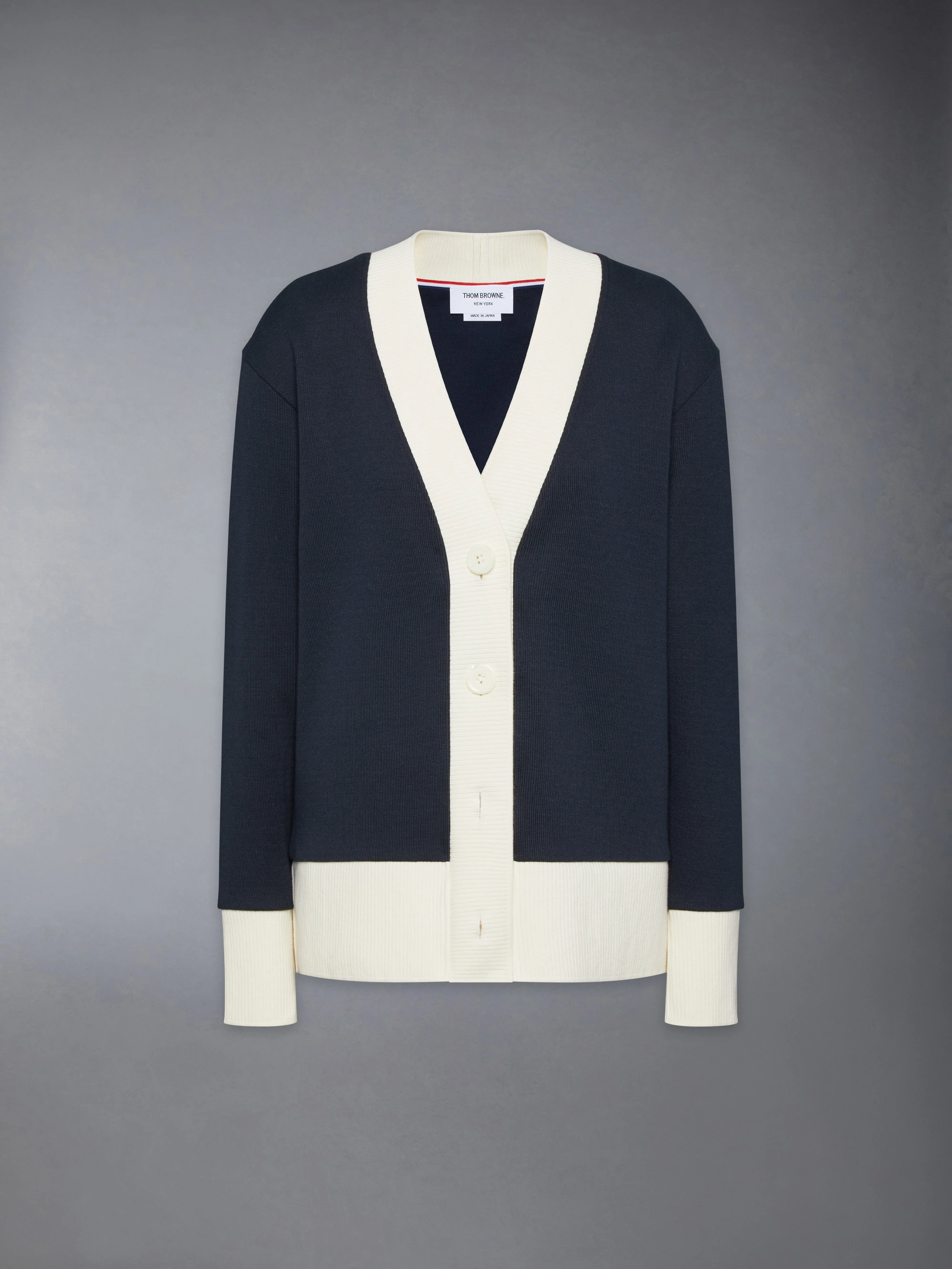 This oversized cardigan is a wardrobe staple designed for ultimate comfort. Its relaxed fit makes it perfect for effortless layering over an oxford shirt or casual tee. Dress it up with our Shadow Stripe Pique Weave Tie. Front button closure Signature striped grosgrain loop tab Model is 5'10" (178 cm), wearing size 40 100% Cotton Made in Italy FJT395A-J0223-415