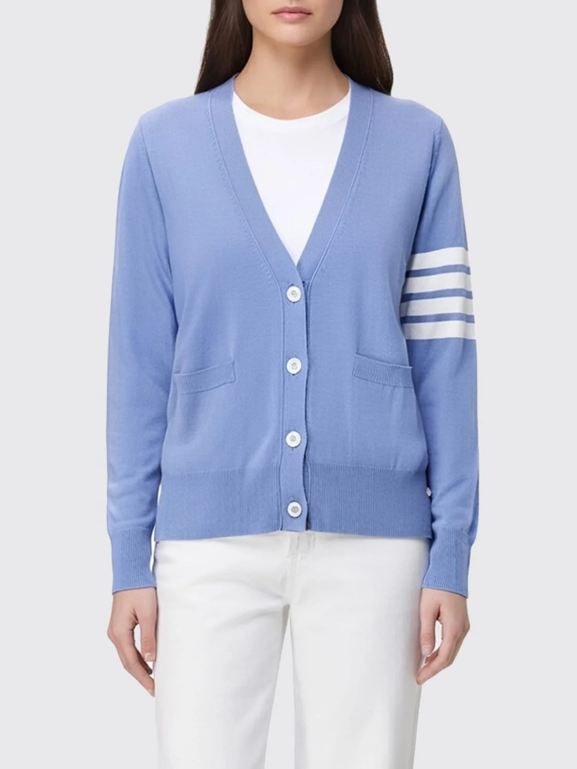 DESCRIPTION - Style: College - Neckline: V neckline - Shoulders: Regular - Sleeves: Long - Cuffs: Ribbed - Closure: With buttons - Pockets: Patch pocket - Bottom: With straight hemline - Logo: Thom Browne 4-bar - Materials: Virgin wool - Pattern: Plain-colored DETAILS AND CARE Composition 100% virgin wool SIZE AND FIT Sizes not available Size and fit Slim fit Designer code: FKC334AY1014 482 Giglio Code: H13778 Designer: Thom Browne Collection: Thom Browne Woman Category: Clothing Thom Browne