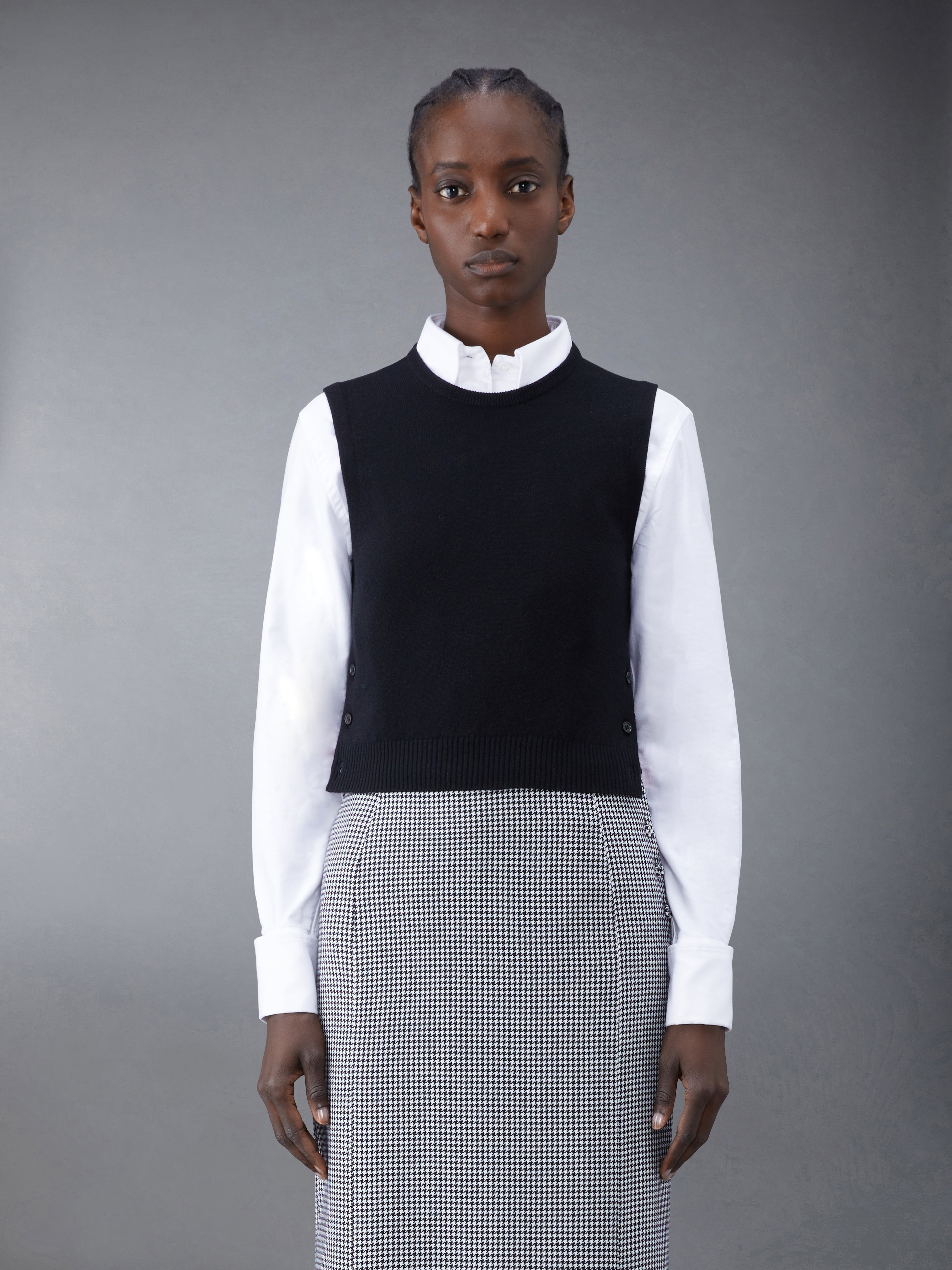 Cropped crew neck shell top in black cashmere. Ribbed cuffs and hem. Buttoned side vents with signature striped grosgrain trim. Signature striped grosgrain loop tab at back of neck. Model is 5'10" (178 cm), wearing size 40 100% Cashmere Made in United Kingdom FKV170A-Y2001-001