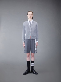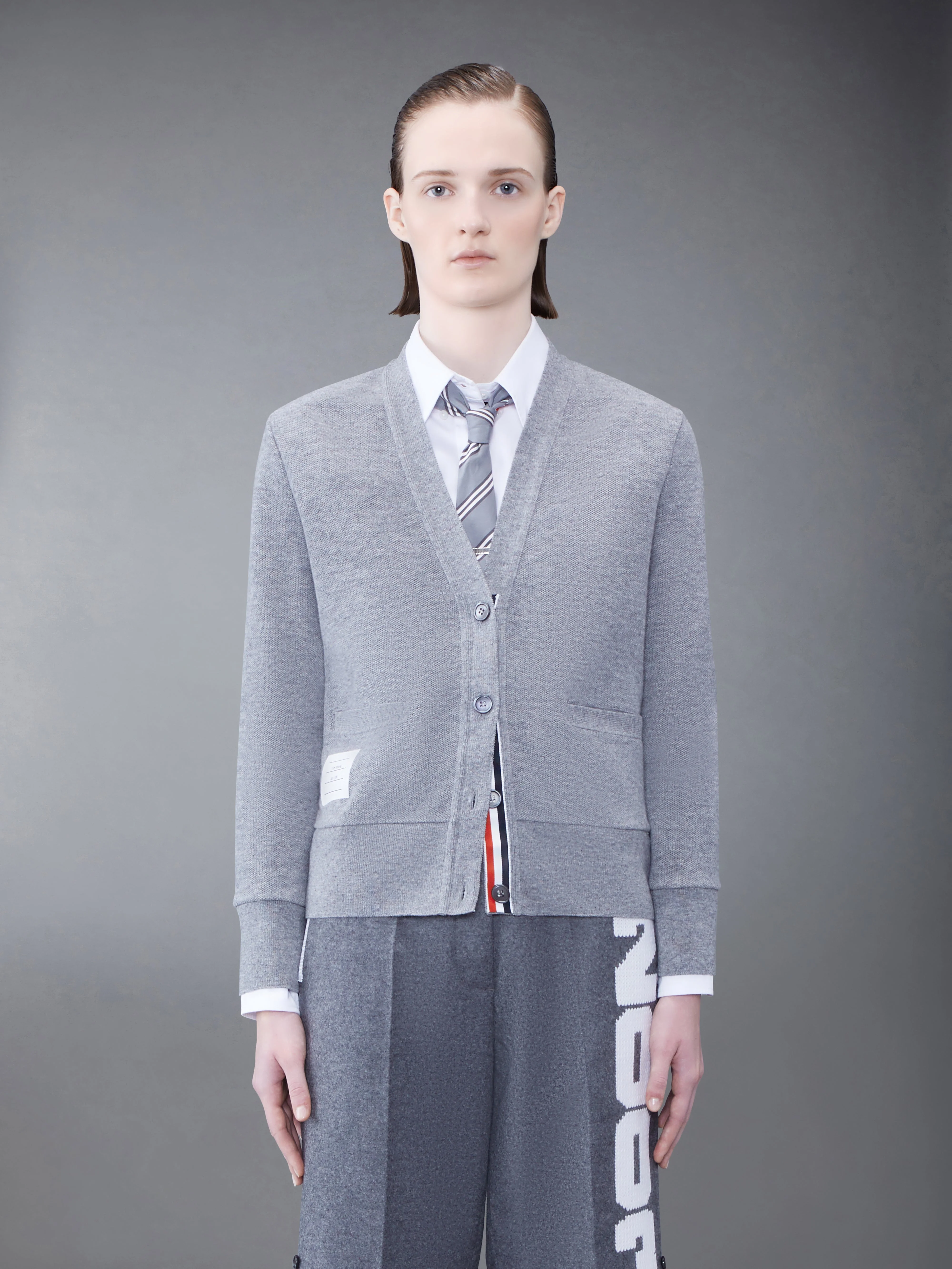 DETAILS & FIT V-neck cardigan in grey cashmere pique with embroidered '2003' at back in white thread. Front button closure with striped grosgrain placket, 2 slip front pockets, name tag applique above hem. Signature striped grosgrain loop tab at back of neck. Model is 5'10" (178 cm), wearing size 40 100% Cashmere Combo 1: 50% Wool, 50% Acrylic Made in Italy FJT158E-07542-055