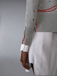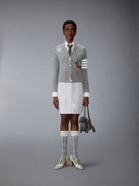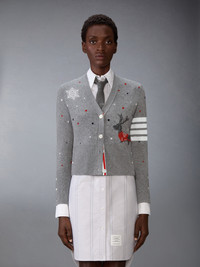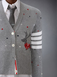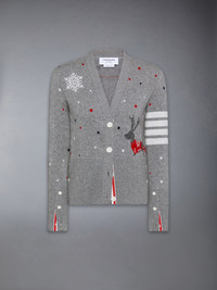 A festive twist on a Thom Browne signature. This classic cardigan is knit in soft cashmere and animated by a playful jacquard scene featuring sleds, snowflakes, reindeer—and Hector, the beloved dachshund, in holiday form. Designed with warmth, charm, and seasonal whimsy in mind, it brings storytelling to tradition. V-neckline Front button closure with RWB grosgrain placket Ribbed buttoned cuffs with RWB grosgrain trim Buttoned side vents with RWB grosgrain trim Ribbed hem Signature striped grosgrain loop tab Model is 5'10" (178 cm), wearing size 40 98% Cashmere, 1% Elastane, 1% Polyamide Made in Italy FKC685A-Y2001-055