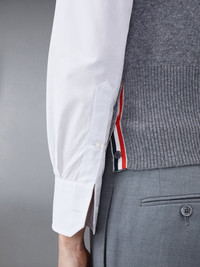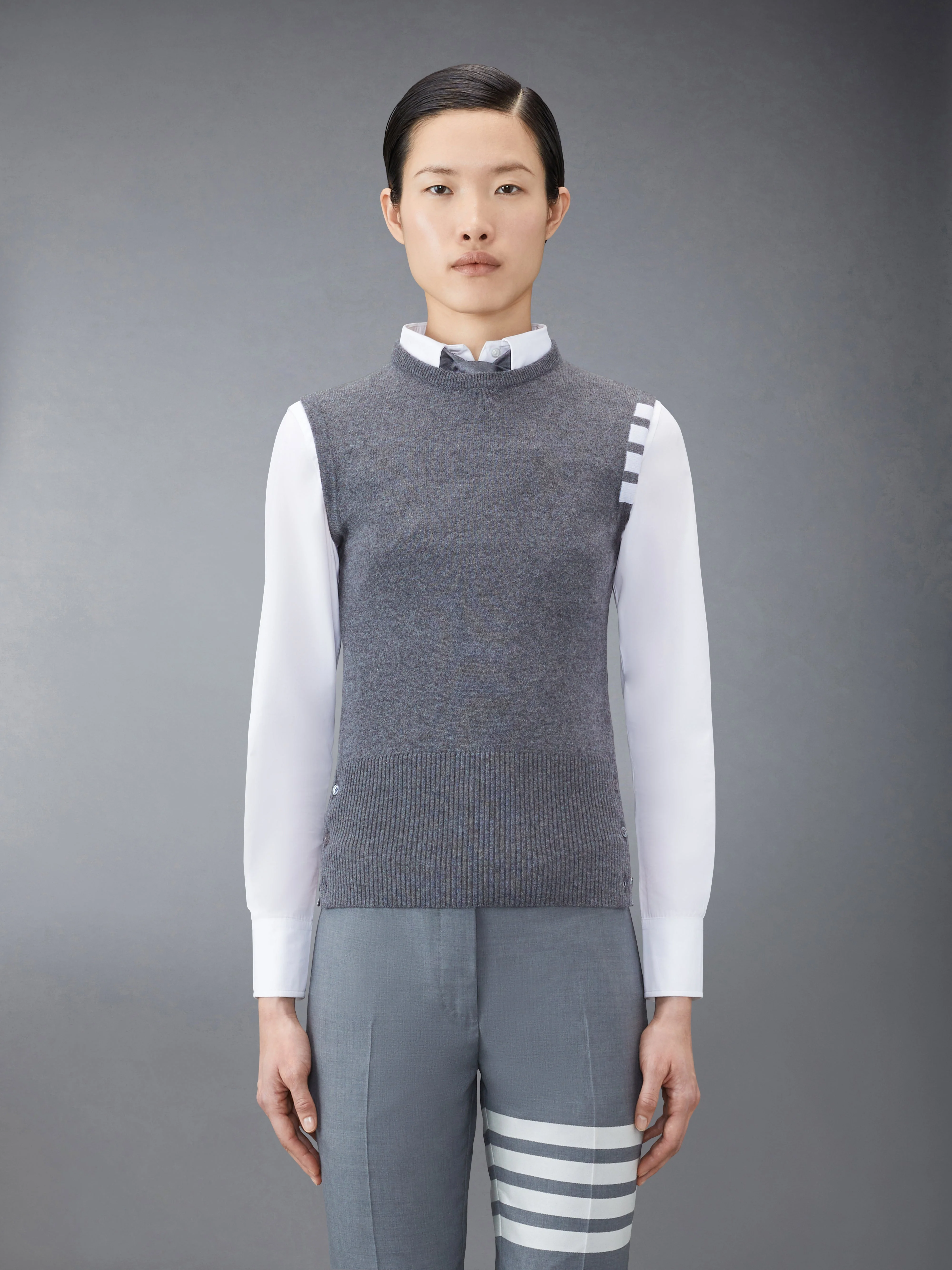 DETAILS & FIT With our signature stripes engineered at the shoulder, our Classic Cashmere 4-Bar Shell Top is a buildable layer that pairs perfectly with any of our classic shirts. Crew neck Front button closure with striped grosgrain placket 4-bar stripe detail at left shoulder Buttoned side vents with signature striped grosgrain trim Signature striped grosgrain loop tab at back of neck Model is 5' 10" (178cm), wearing size 40 100% Cashmere Made in the UK FKV001A-00011-025 - Length: 55.0cm - BUST: 70.0cm - Shoulder Width: 32.0cm