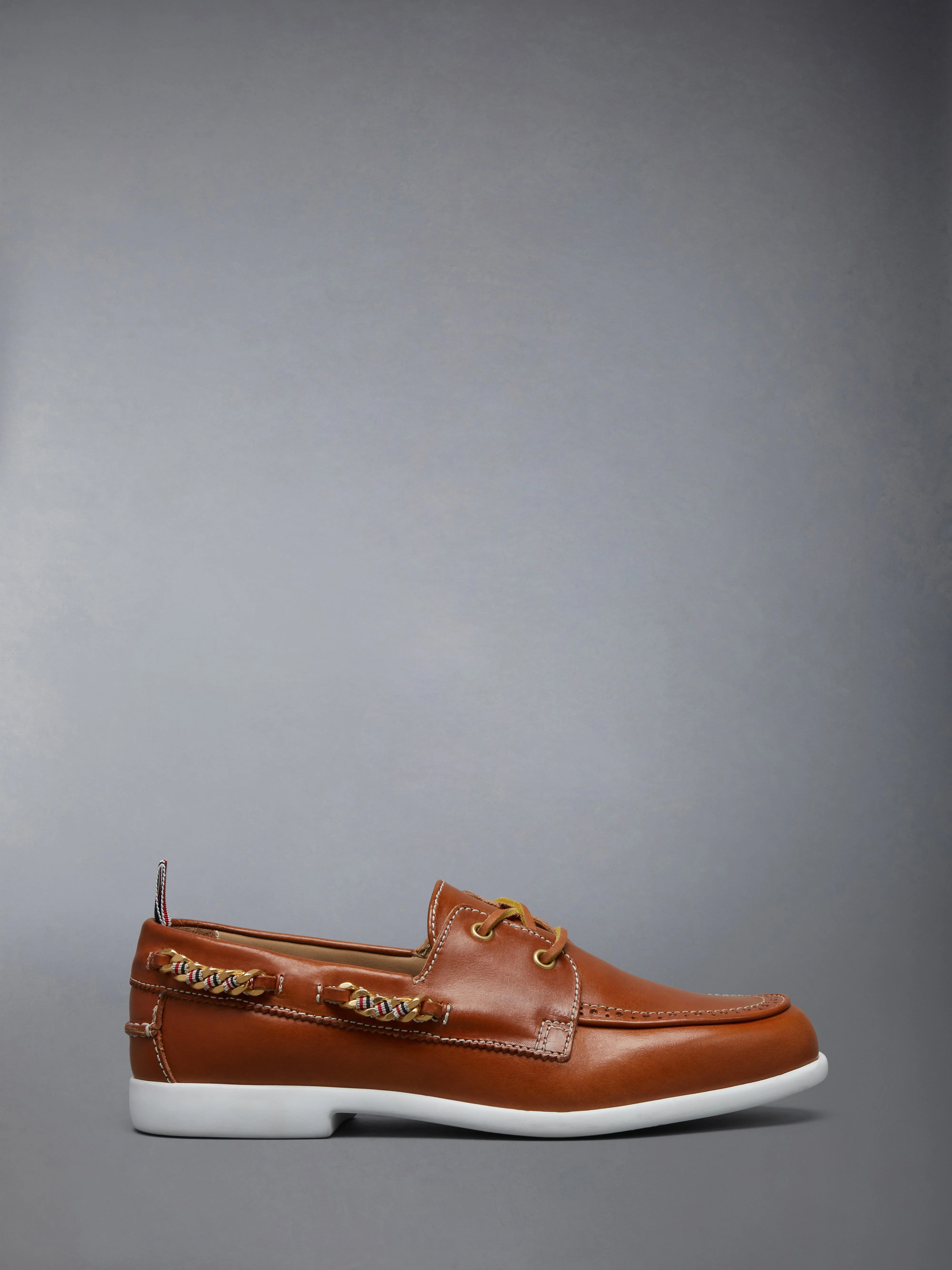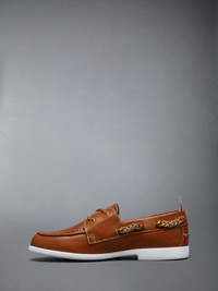 This refined pair of boat shoes redefines nautical chic with a perfect balance of classic design and modern sophistication. Featuring premium vachetta leather and distinctive grosgrain trim, they deliver unparalleled comfort and durability when navigating coastal landscapes or urban cities. Your ultimate companion on every journey. Pair these with our brown corduroy pieces. Lace up Signature striped grosgrain loop tabs at heels Upper: 100% Calf Leather Sole: 100% Rubber Lining: 100% Calf Leather Made in Italy FFF190B-L0044-255
