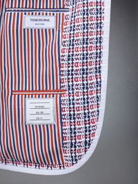 DETAILS & FIT Impeccable craftsmanship, fine fabric, and distinctive Thom Browne emblems make this coat an essential garment for your seasonal wardrobe. Pair it with any of our spring trousers or dress skirts for a refined spring look. Our luxurious tweed fabric is sourced from a fabric mill founded in 1912 in Carlisle, England. Front button closure 2 Flap pockets Single chest pocket Buttoned cuffs with signature striped grosgrain trim Double vented back Striped lining with interior pocket and name tag Signature striped grosgrain loop tab Fit 3 - Slim fit Model is 5'10" (178 cm), wearing size 40 100% Cotton Lining: 100% Silk FBC812B-F0515-960