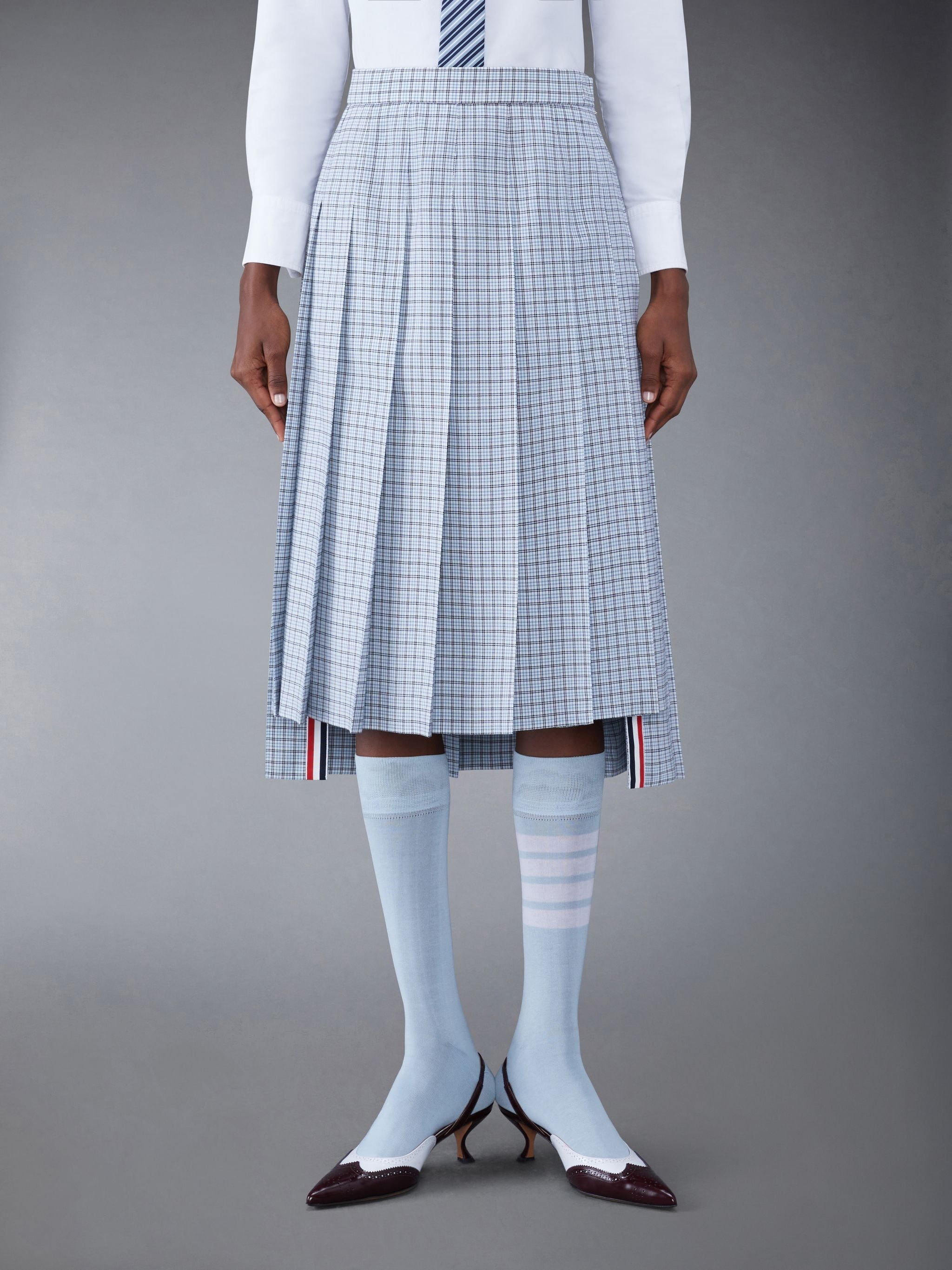 DETAILS & FIT Inspired by East Coast preppy icons, this skirt is a fresh take on a classic silhouette. Featuring a playful check pattern — a celebration of the season. Side zip closure Dropped back hem Signature striped grosgrain loop tab Model is 5'10" (178 cm), wearing size 40 100% Wool Lining: 100% Cupro FGC400A-F0497-460