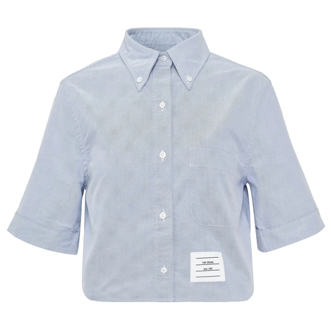 600069031LBL036 / CP-FLL205A-F0313/00/480 - Button-down point collar - Three-quarter sleeves with turn-up cuffs - Full button front closure - Left chest pocket - Cropped hem design - Cotton oxford construction - Relaxed fit - Signature white label patch The Thom Browne Classic Cropped Point Collar Shirt delivers refined tailoring with the brand's signature contemporary proportions. Crafted from premium cotton oxford in soft blue chambray, featuring meticulous construction and clean finishing details. The cropped silhouette and signature white label detail create a modern interpretation of classic shirting.