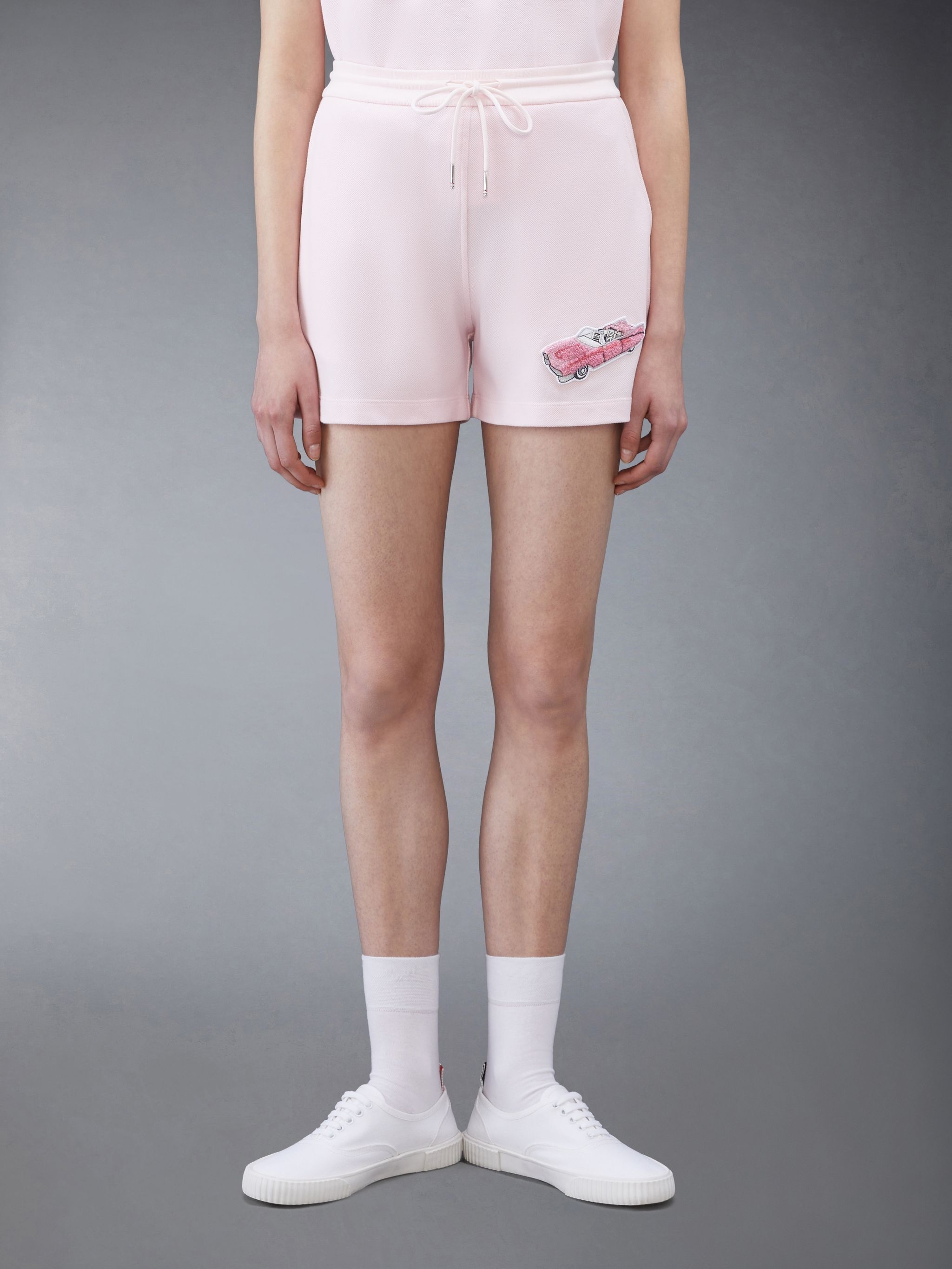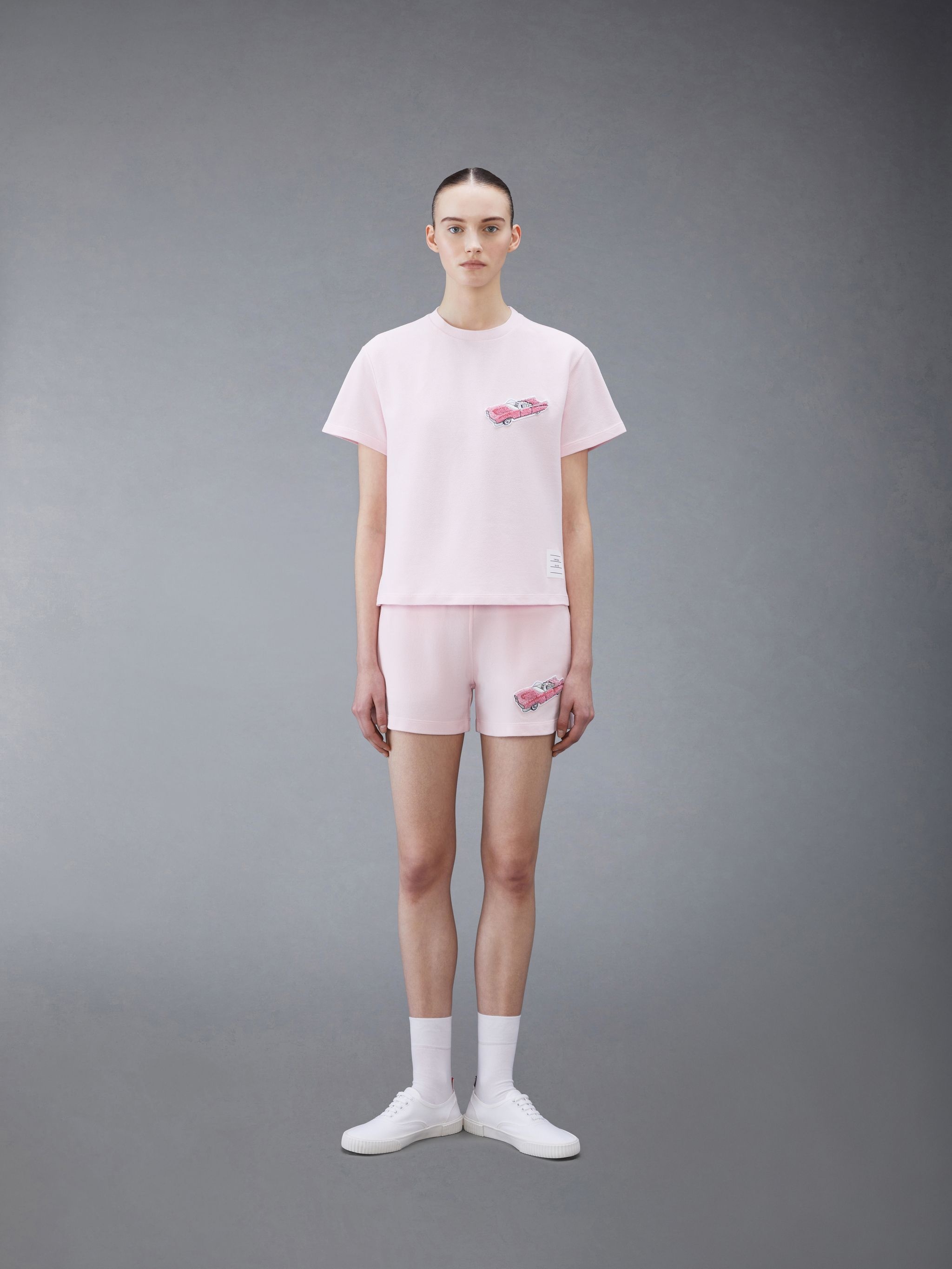 DETAILS & FIT Oversized tee in light pink classic cotton pique with pink car patch applique at chest. Crew neckline, name tag applique above hem. Side vents with striped grosgrain trim. Signature striped grosgrain loop tab at back of neck. Model is 5'10" (178 cm), wearing size 40 100% Cotton Made in Italy FJS149E00050680