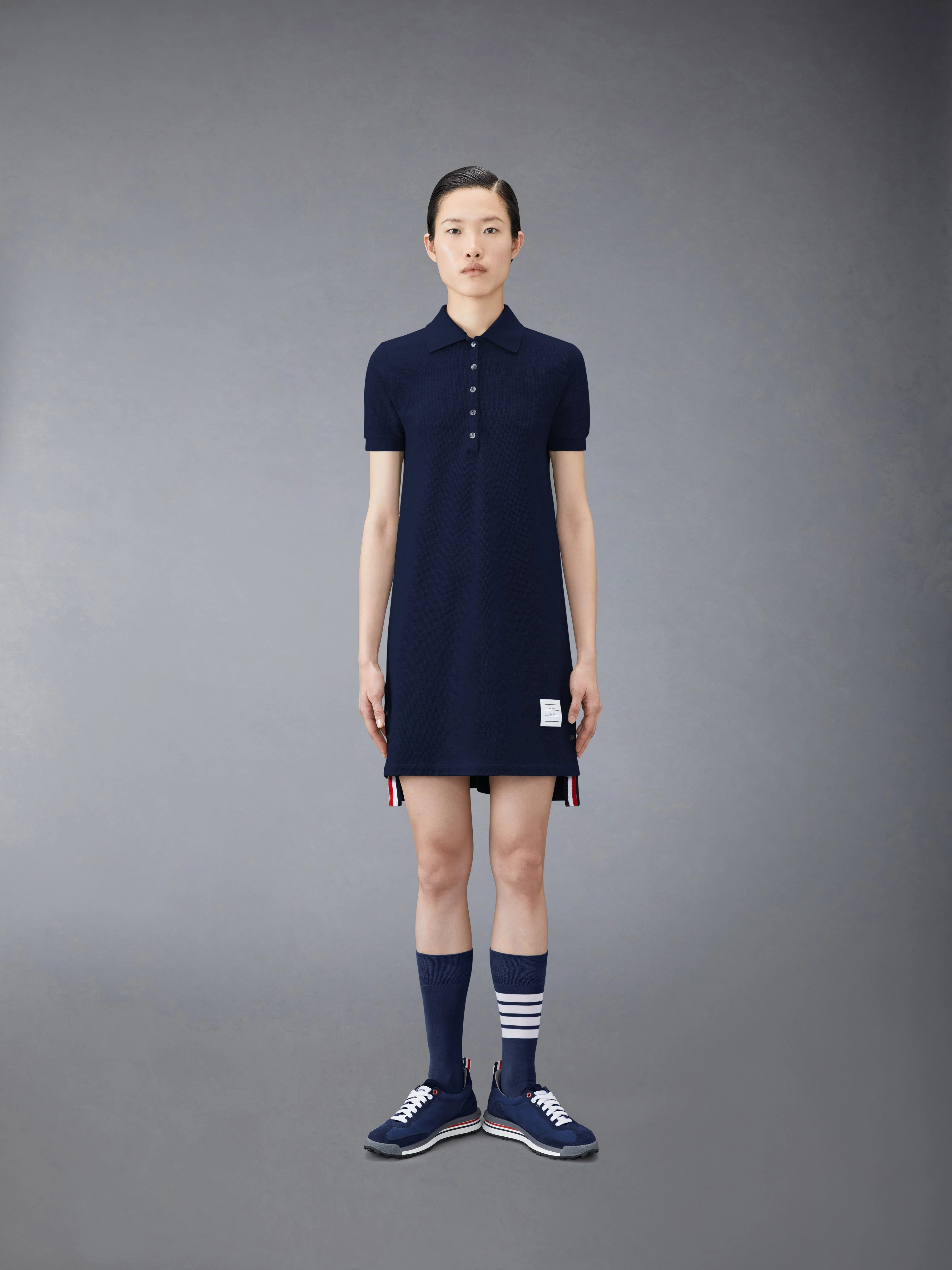 Inspired by East Coast preppy icons, our Classic Pique Stripe Polo Dress borrows from Thom Browne's very own love of sport. Find our signature nametag applique at the front hem and our distinct grosgrain trip at the back. Partial button placket Spread polo collar Name tag applique above hem Buttoned side vents with signature striped grosgrain trim Name tag applique above hem Center back stripe Model is 5' 10" (178cm), wearing size 40 100% Cotton Made in Italy FJD027A-00050-415