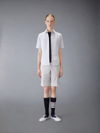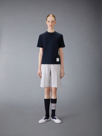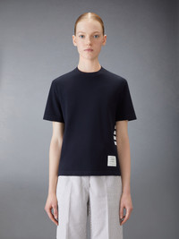 A silhouette that has stood the test of time, our Classic Pique 4-Bar Tee is adorned with signature Thom Browne emblems throughout, and tailored to perfection. Crew neckline 4-bar stripe detail at left side Name tag applique above hem Signature striped grosgrain loop tab at back of neck Model is 5'10" (178 cm), wearing size 40 100% Cotton Made in Italy FJS207A-00050-415
