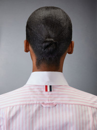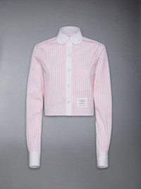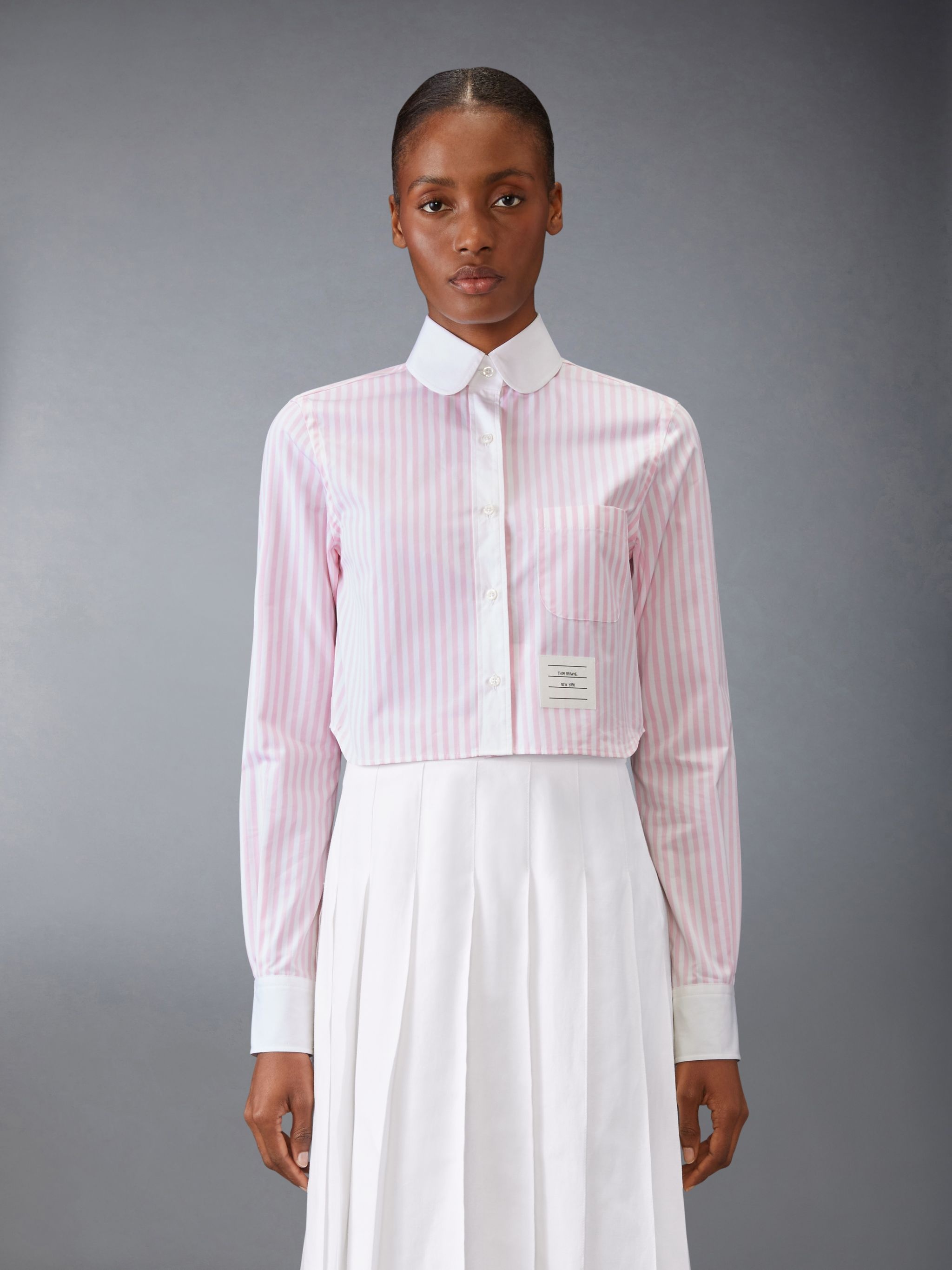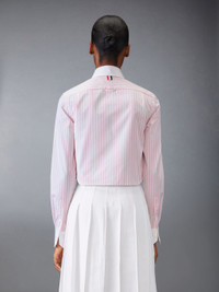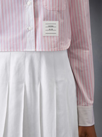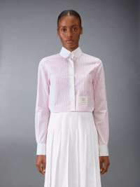 DETAILS & FIT Our Classic Poplin Cropped Shirt exhibits quality craftsmanship and meticulous tailoring. Featuring definitive Thom Browne emblems throughout. Front button closure Name tag applique Pleated back yoke with locker loop Signature striped grosgrain loop tab Model is 5'10" (178 cm), wearing size 40 100% Cotton Made in Italy FLL164C-F0782-680