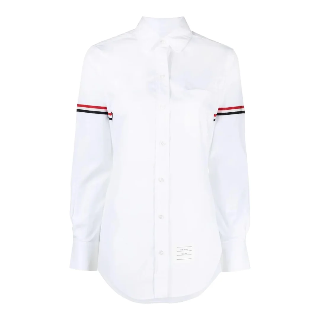 300050011WHT-34 / B6FLL019E-03113/00/100 - Classic round collar design - Signature tricolor stripe detailing on sleeves - Premium cotton poplin construction - Button-front closure - Long sleeves with button cuffs - Tailored fit - Grosgrain ribbon accent trim The Thom Browne Classic Round Collar Shirt delivers refined elegance with signature preppy sophistication. Crafted from premium crisp cotton poplin in clean white, featuring the brand's iconic tricolor striped detailing on the sleeves. The distinctive round collar construction and meticulous tailoring create a sophisticated statement piece for discerning wardrobes.