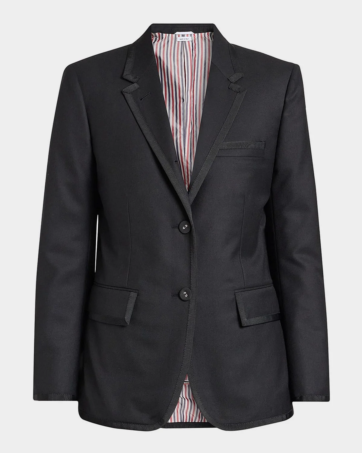Crafted from wool suiting, this classic blazer jacket from Thom Browne features grosgrain-trimmed edges and a signature striped tab on the back of the neck Notch lapels; single-breasted front Long sleeves; button cuffs Chest welt pocket Hip flap pockets Slim, fit 1 silhouette Hip length Double walking vent back Wool Lining: Cupro Dry clean Made in Italy