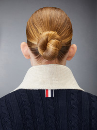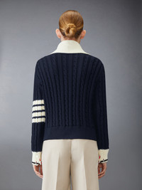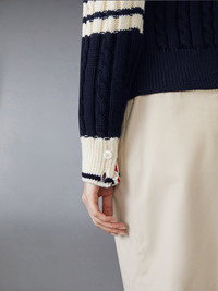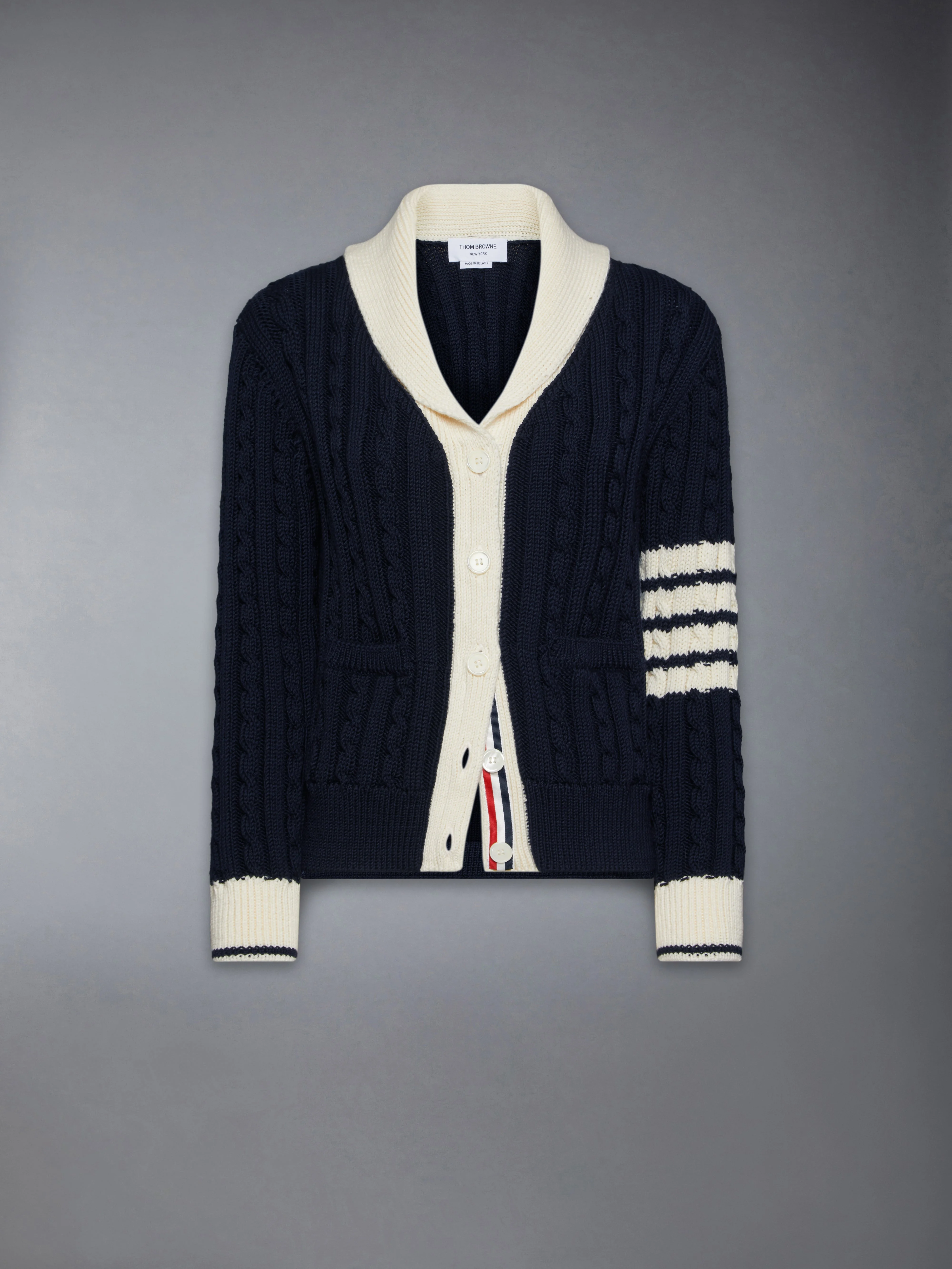 DETAILS & FIT A classic silhouette that will stand the test of time, our Classic Wool 4-Bar Cable Knit Cardigan. Layer it over any of our signature dress shirts or tees. Front button closure with striped grosgrain placket 4-bar detailing 2 Front slip pockets Signature striped grosgrain loop tab Model is 5'10" (178 cm), wearing size 40 100% Virgin Wool Made in Ireland FKC626A-Y1024-415