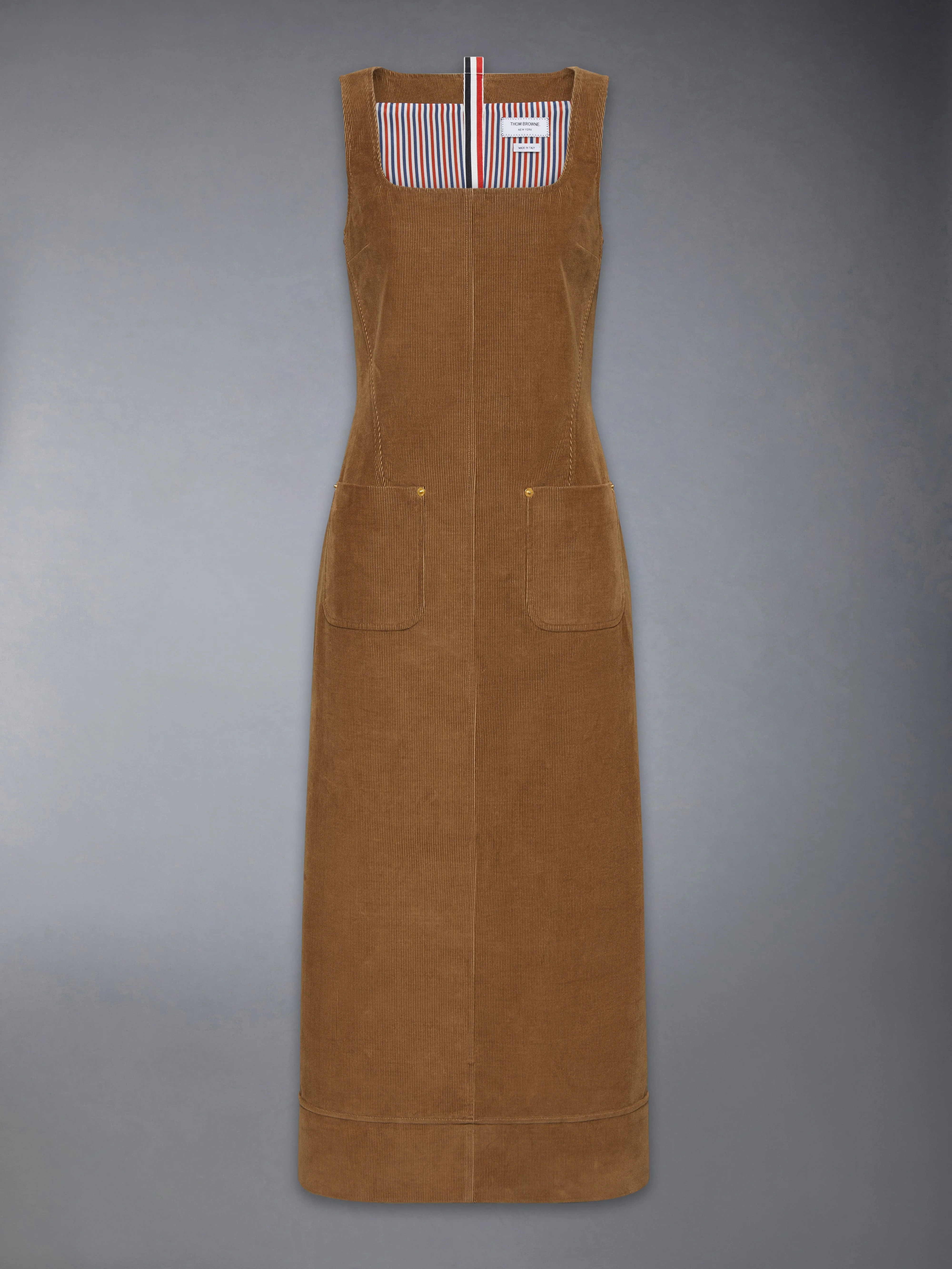 A refined take on rustic charm, this corduroy midi dress is designed with a square neckline, gold rivets, and a relaxed fit. It's a simple joy in every way—effortless and stunning. Our brown corduroy fabric undergoes a delicate brushing process to give it a beautiful sheen. Back zip closure 2 Front patch pockets Signature striped grosgrain loop tab Model is 5'10" (178 cm), wearing size 40 100% Cotton Lining: 100% Silk Made in Italy FDSF20A-F0957-210