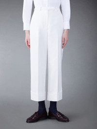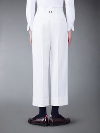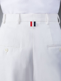 DETAILS & FIT A sophisticated trouser with a shortened hem that pays homage to Thom Browne’s distinguished tailoring. Tab front closure Slip side pockets Button-fastening back welt pockets Signature striped grosgrain loop tab Model is 5'10" (178 cm), wearing size 40 100% Cotton FTC444U-F0345-114