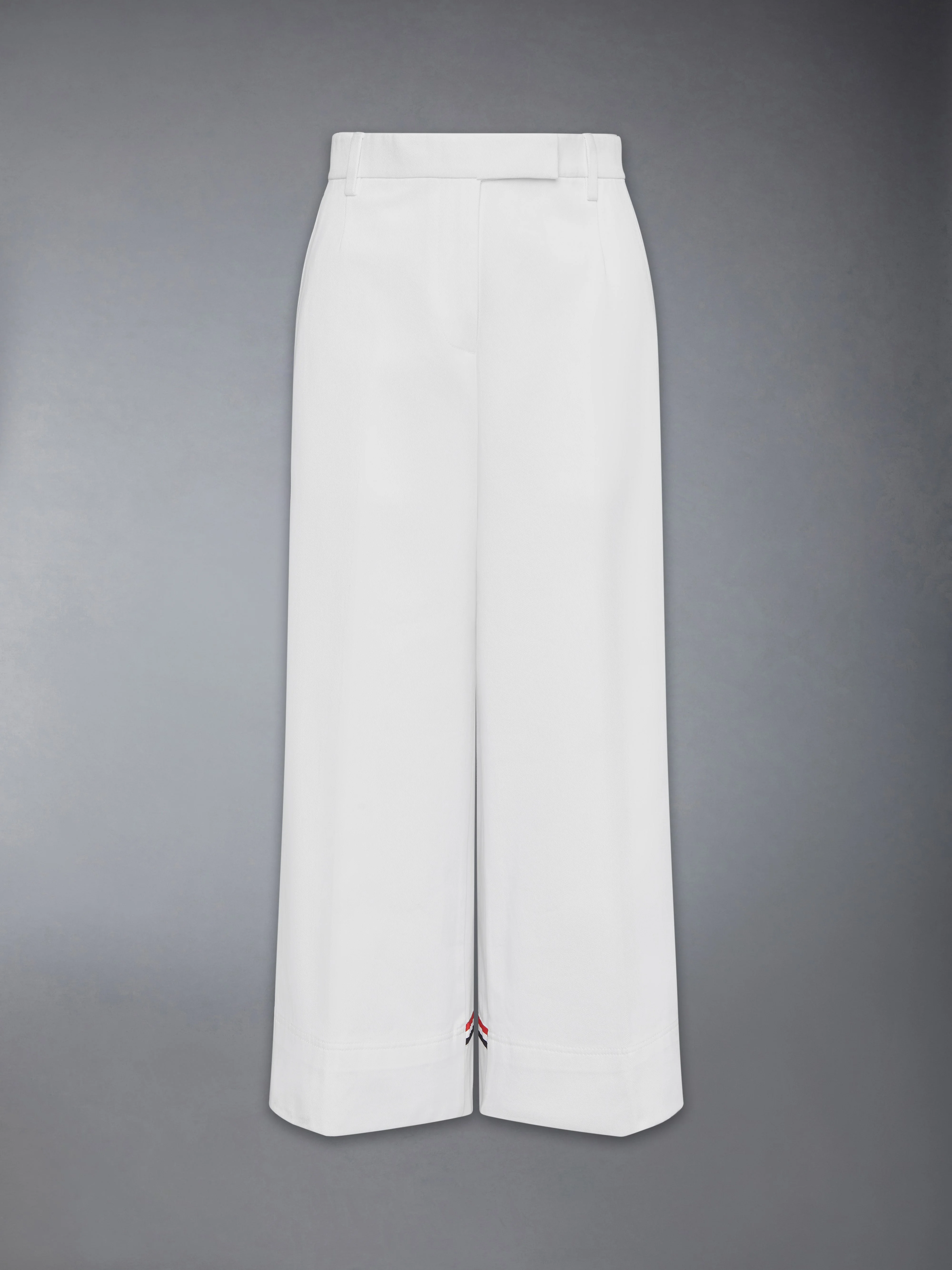 Crafted in cotton gabardine with a weightier hand, these chinos balance structure with a subtle preppy ease. The defined crease gives clarity to the silhouette, while understated RWB touches echo classic Thom Browne elements in a playful way. Designed with an adaptable attitude, they move between polished and relaxed styling, pairing effortlessly with knitwear, tweed, or technical outerwear. Ankle length Tab closure with zip fly Slip hand pockets Buttoned back welt pockets Creased legs RWB grosgrain trim along back bottom hem Signature striped grosgrain loop tab Model is 5'10" (178 cm), wearing size 40 100% Cotton Made in Italy FTC519U-F0175-100