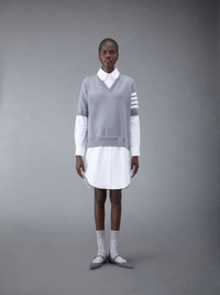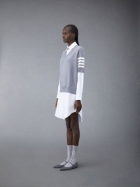 DETAILS & FIT V-neck tee and round collar shirtdress combo in grey cotton Milano and white cotton Oxford with 4-bar stripe detail at left sleeve in white. Front button closure, name tag applique at rounded hem, pleated buttoned cuffs. Buttoned side vents at tee with signature striped grosgrain trim. Signature striped grosgrain loop tab at back of neck. Model is 5'10" (178 cm), wearing size 40 100% Cotton Made in Italy FKD156AY3007035